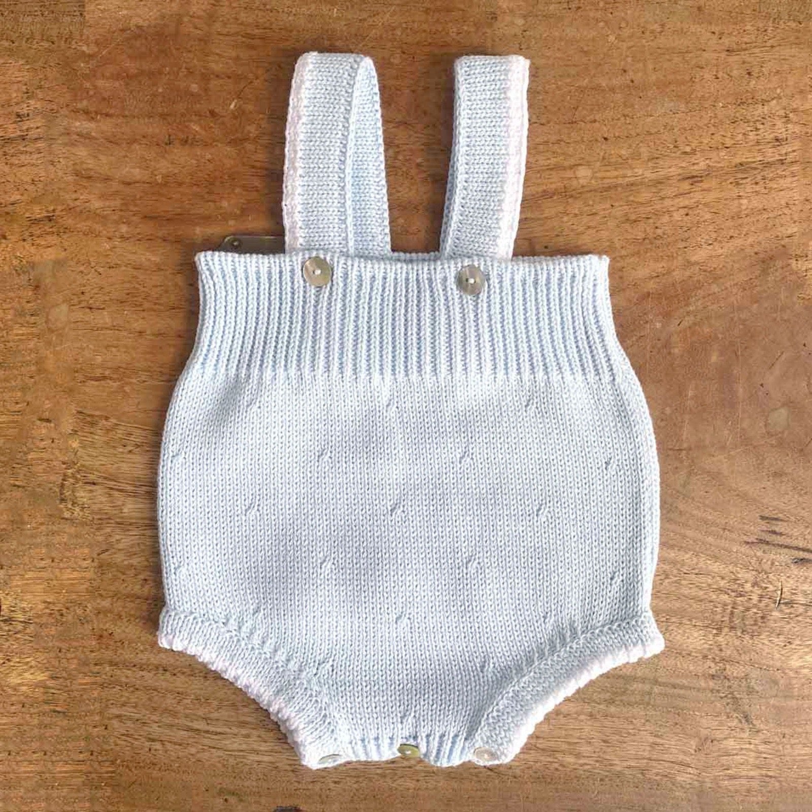 Cotton knitted romper with straps and contrast piping detail. A comfortable and versatile piece. Pair it with a body or collared shirt and the matching sweater from the same line for a perfectly coordinated look. 100% cotton
