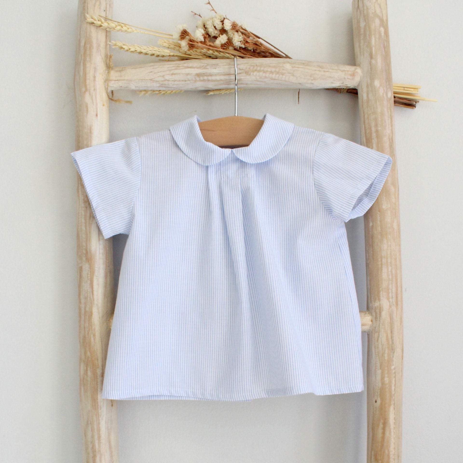 Timeless and elegant baby shirt featuring delicate pleat details and a Peter Pan collar. Made from 100% cotton and crafted in Portugal.