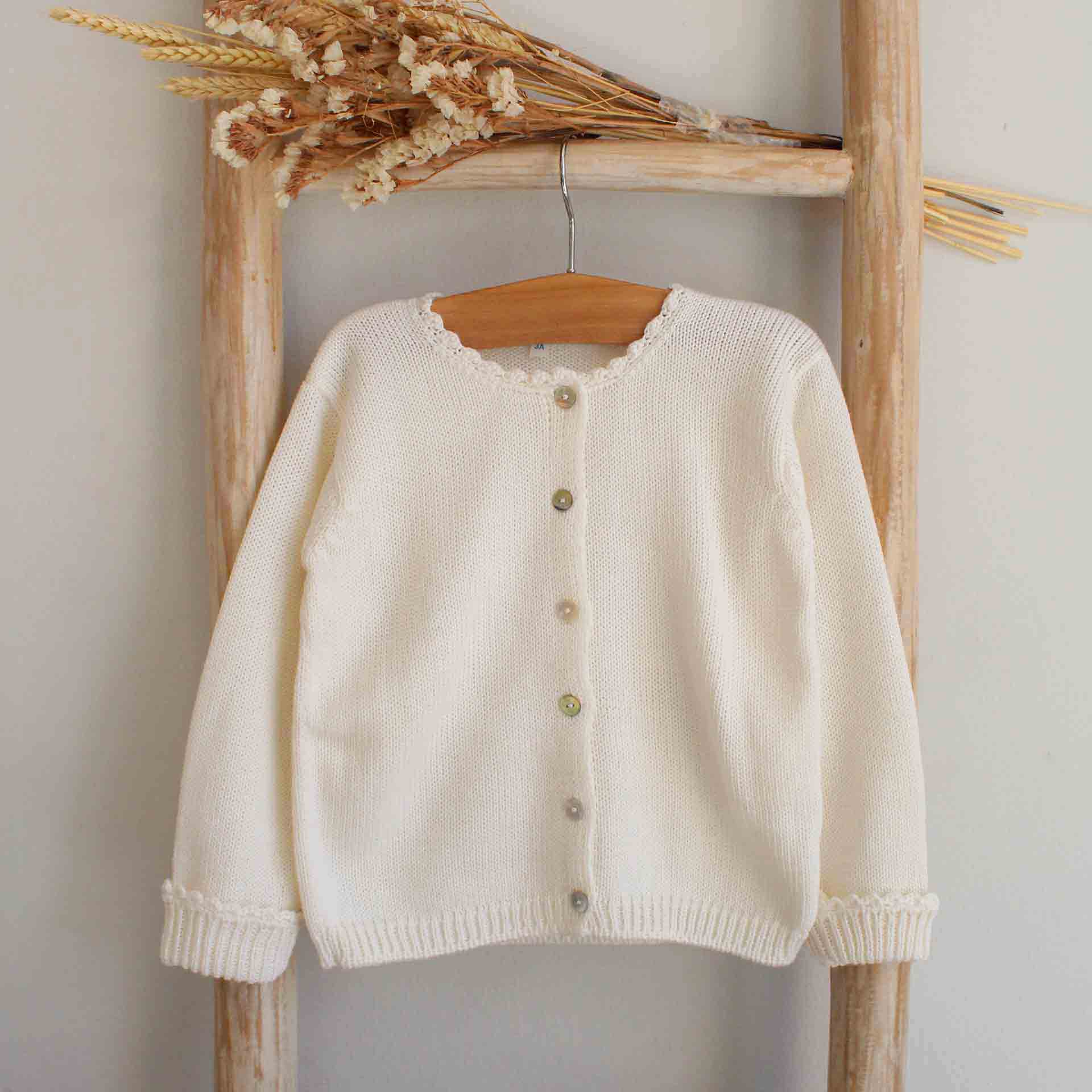 Casaco com punho voltado com pormenor de ondinhas produzido num fio italiano premium, suave na pele, hipoalergénico e sem pêlo. Fabricado de forma artesanal em Portugal.