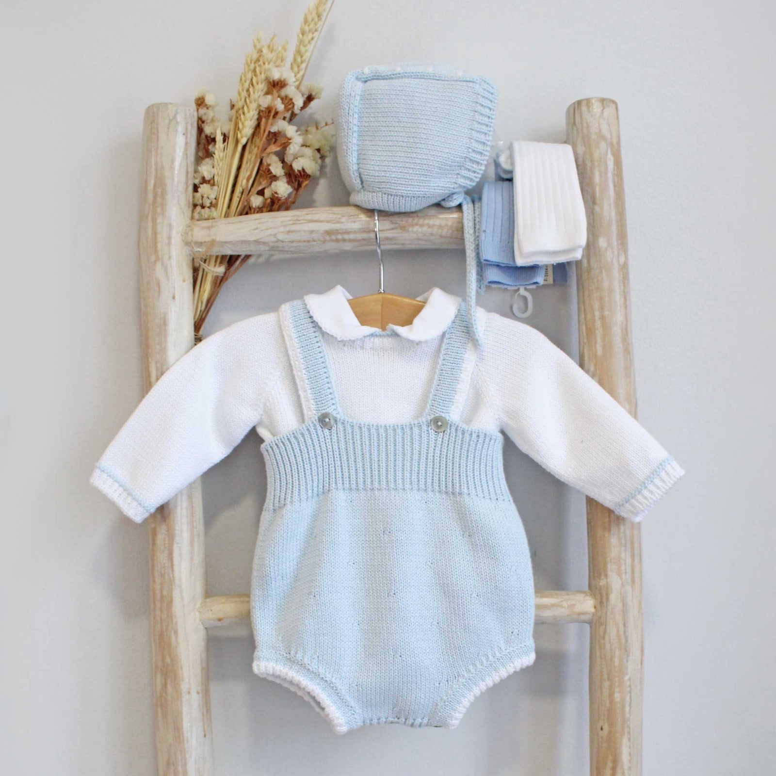 Jardineiras tricotadas em lã com torcidos