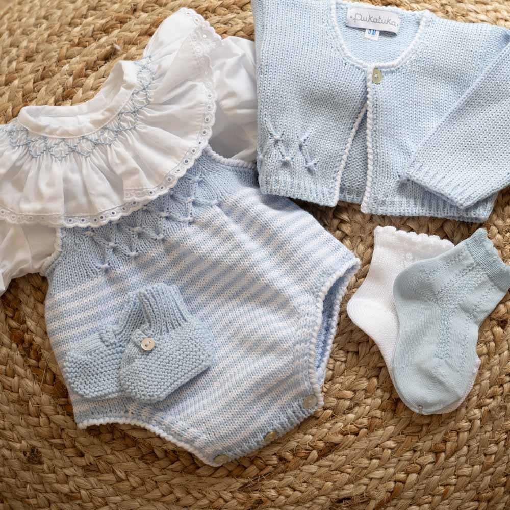 Hand Smocked Knitted Romper with Stripes produced in organic cotton. Pair it with the cardigan from the same line, the adorable boots and the hand smocked shirt in either long or short sleeve for the perfect look. 100% cotton. Produced in Portugal