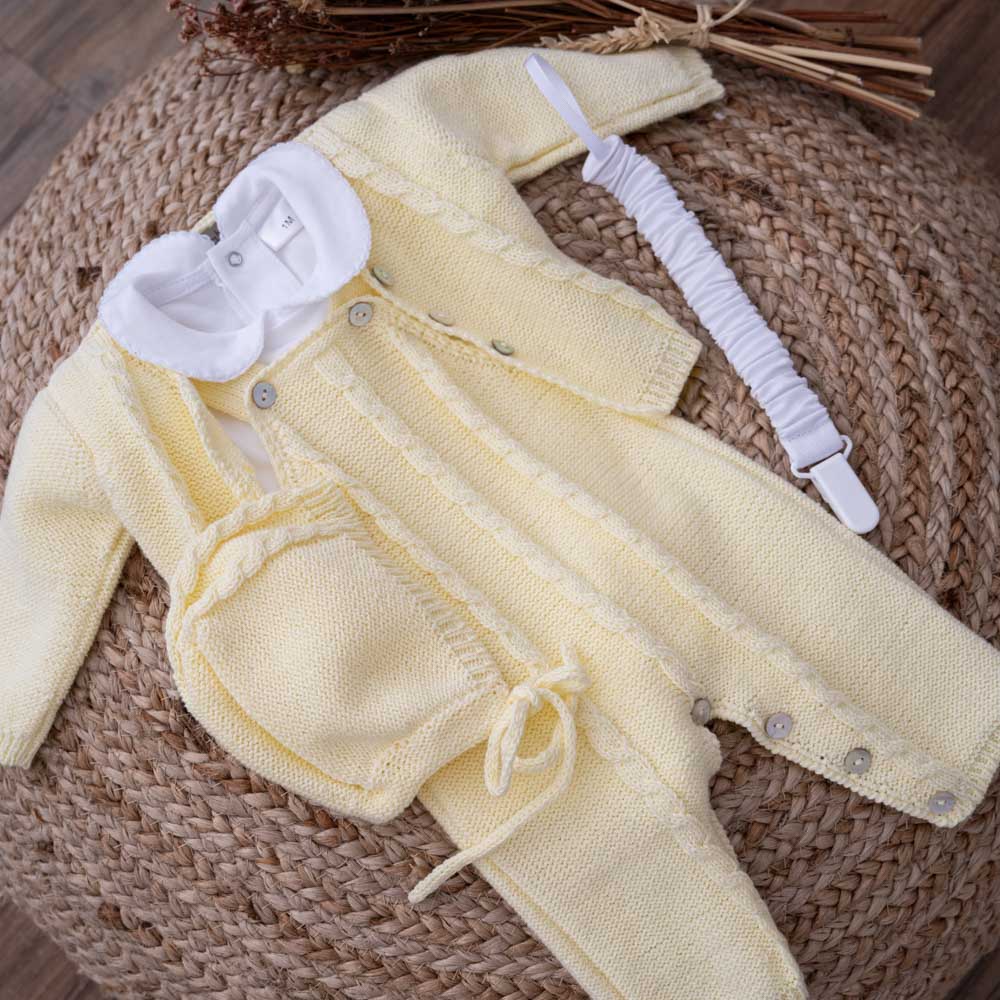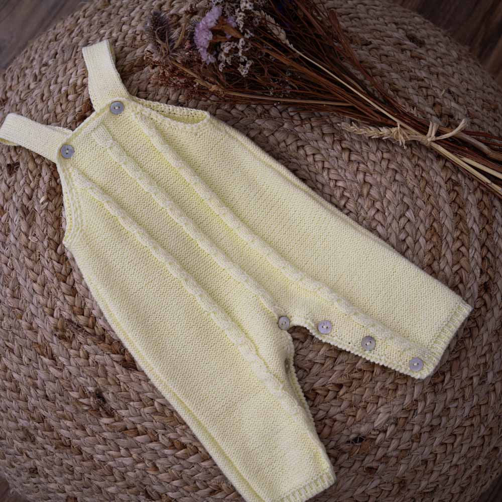 Jardineiras com detalhe de torcidos tricotadas em fio italiano de excelente qualidade, suave e confortável na pele. Produzido em Portugal