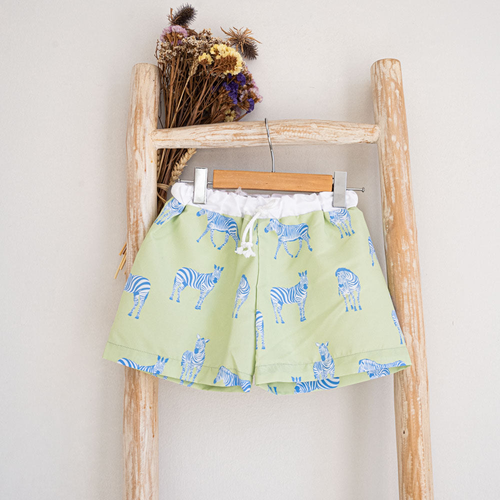 Swim shorts featuring a Zebra print in bright colors, designed with an elasticated waistband and a handy back pocket. Made from 100% recycled polyester and sustainably crafted in Portugal