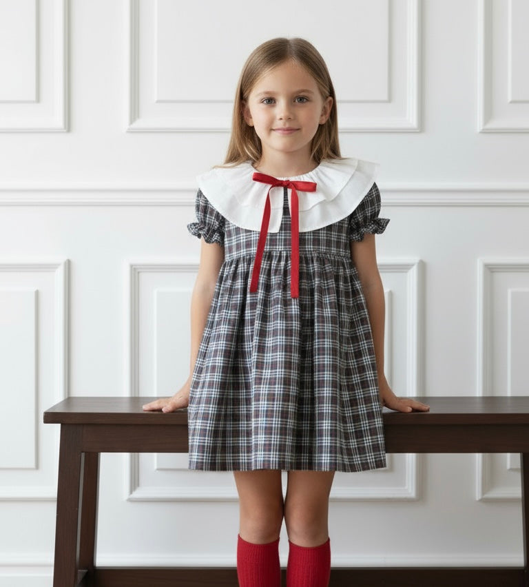 Girls Plaid Dress with Double Ruffled Collar and Bow at Front