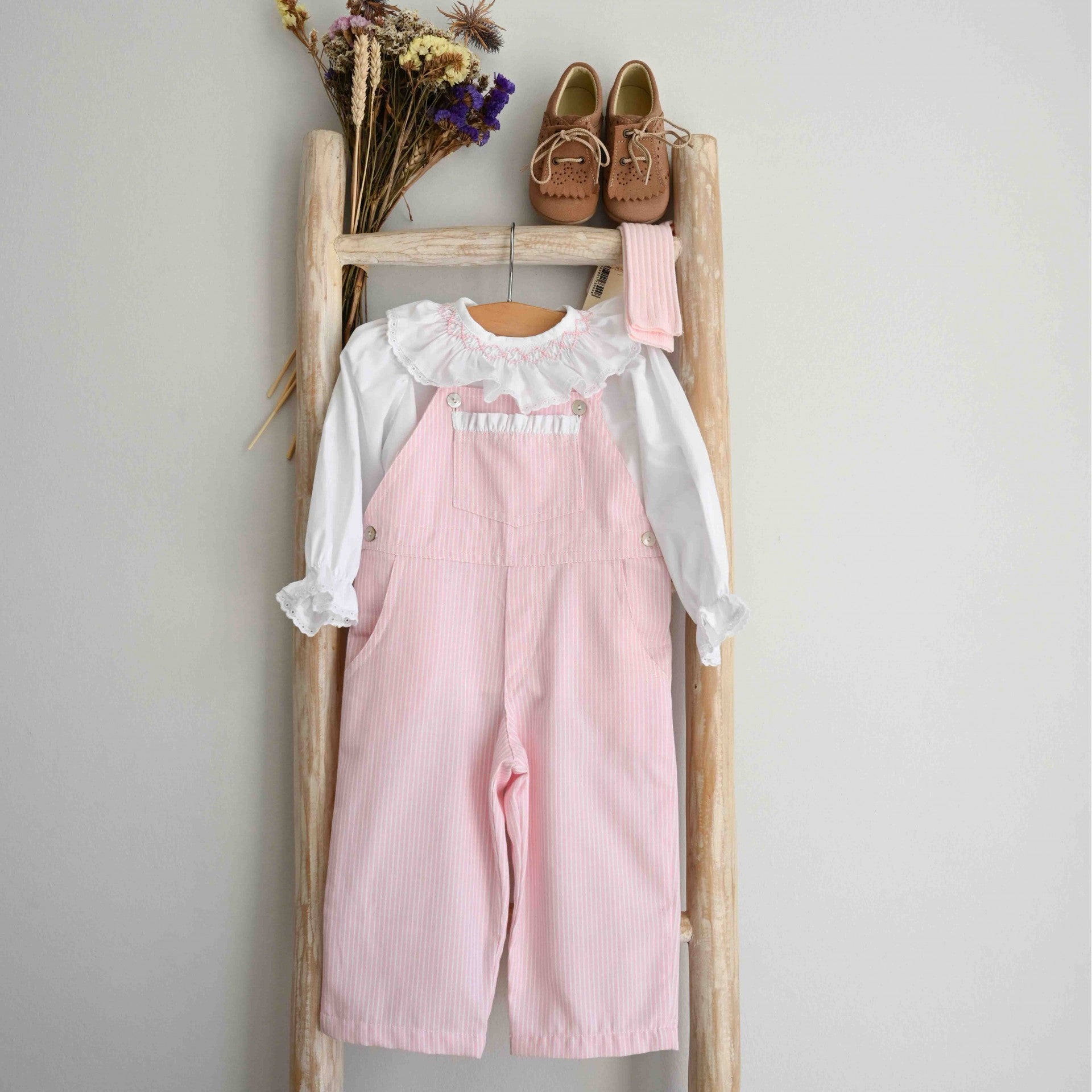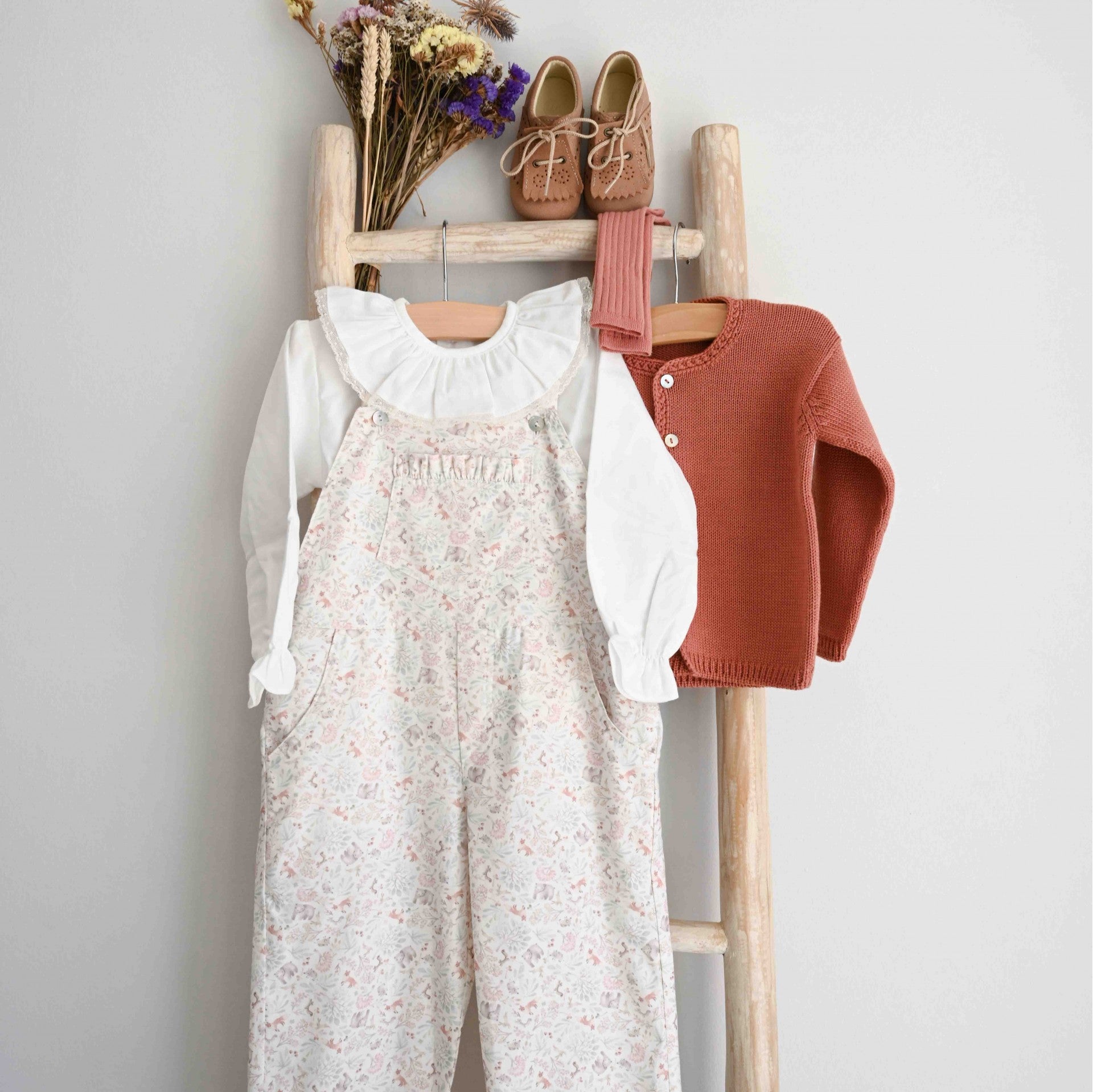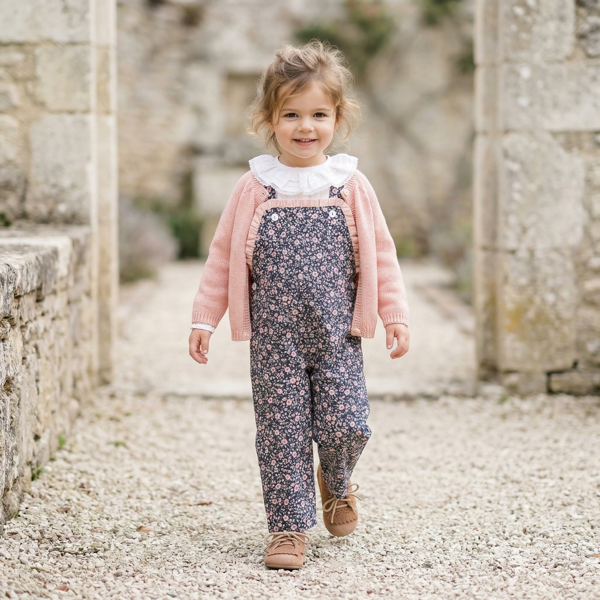 Girls Overalls with Paisley Pattern in Pink Tones and Ruffled Shoulder Detail