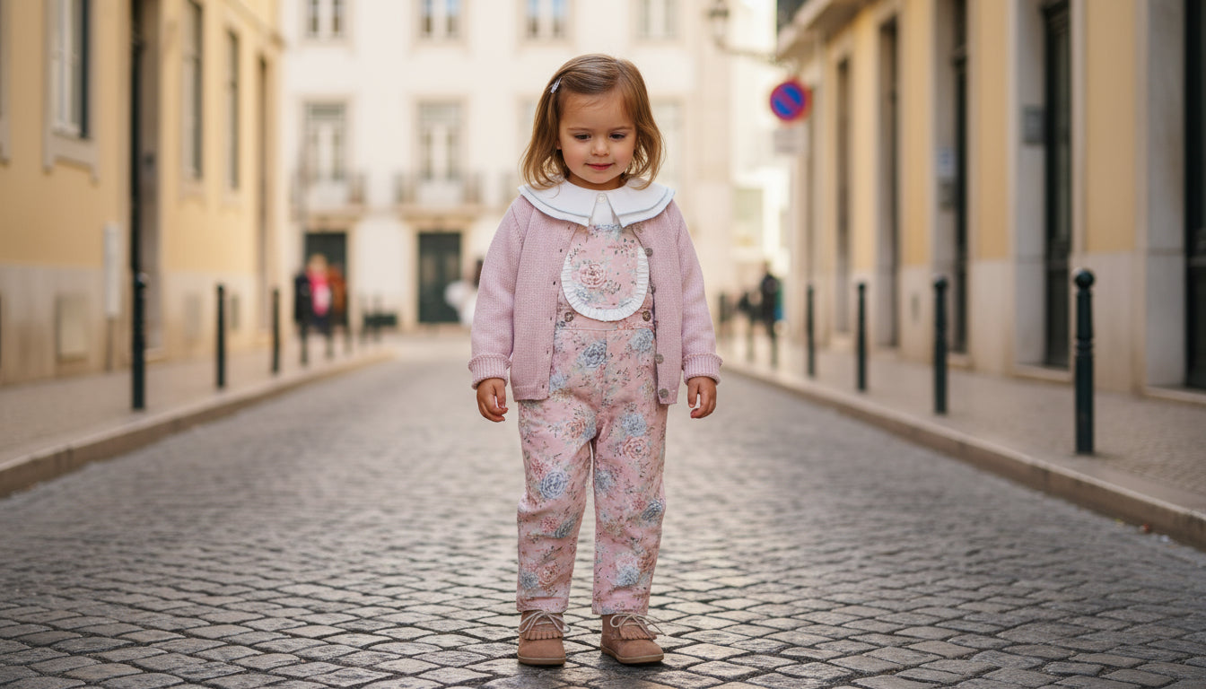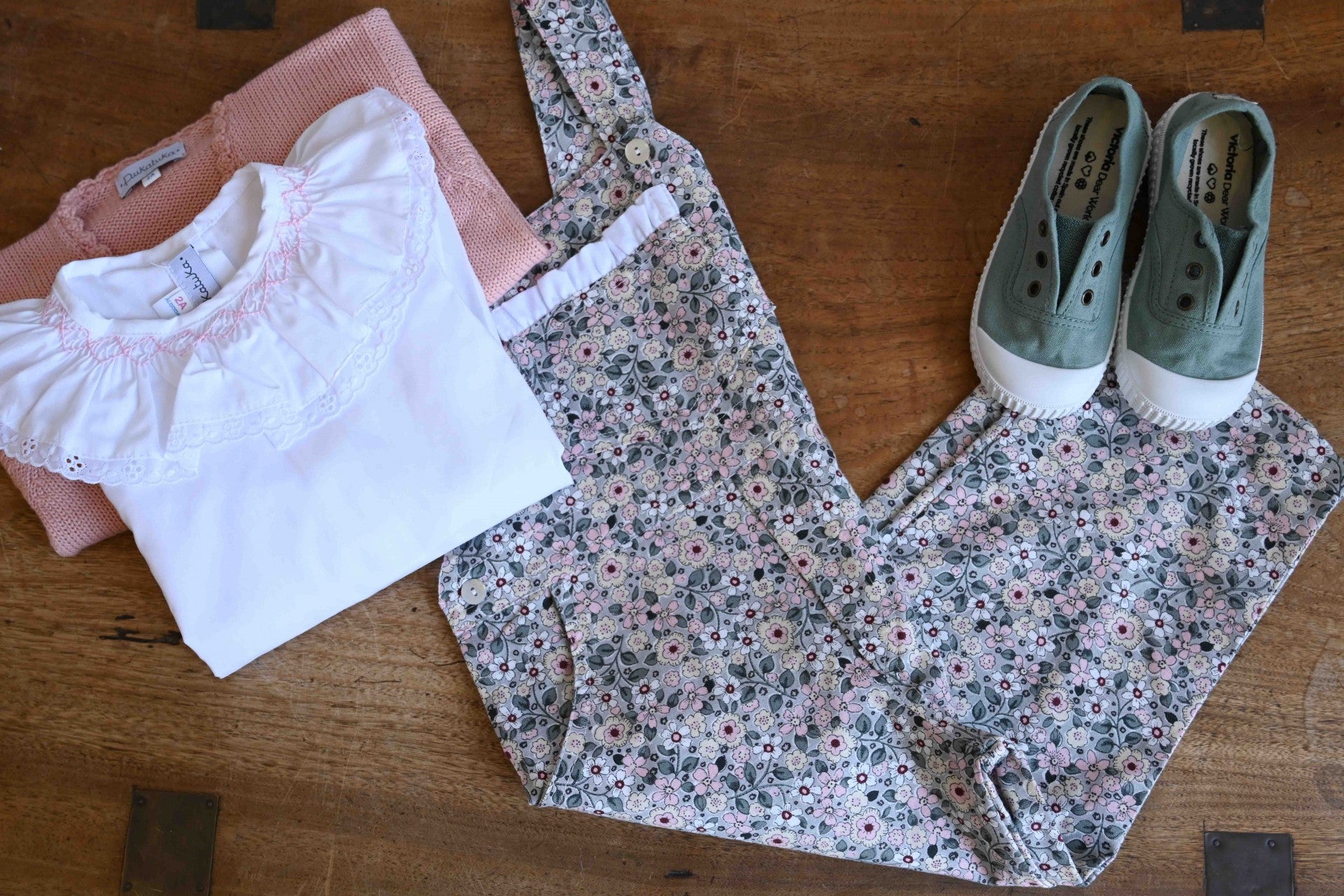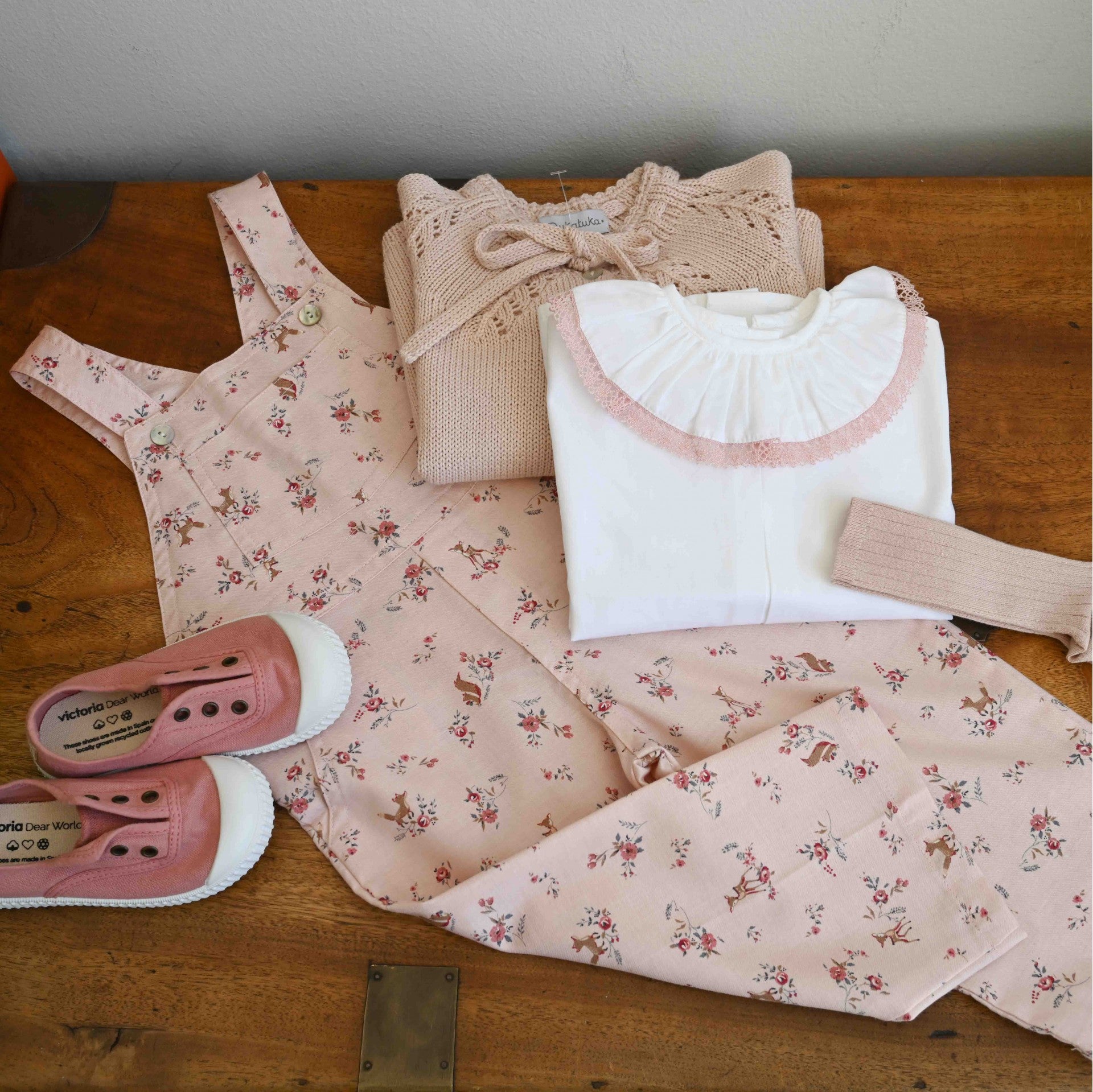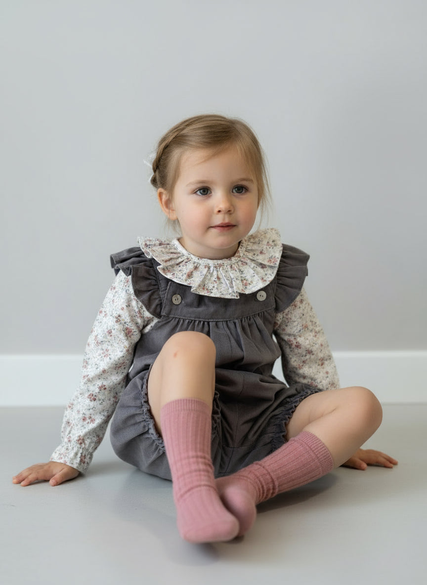 Girls Overalls with Paisley Pattern in Pink Tones and Ruffled Shoulder Detail