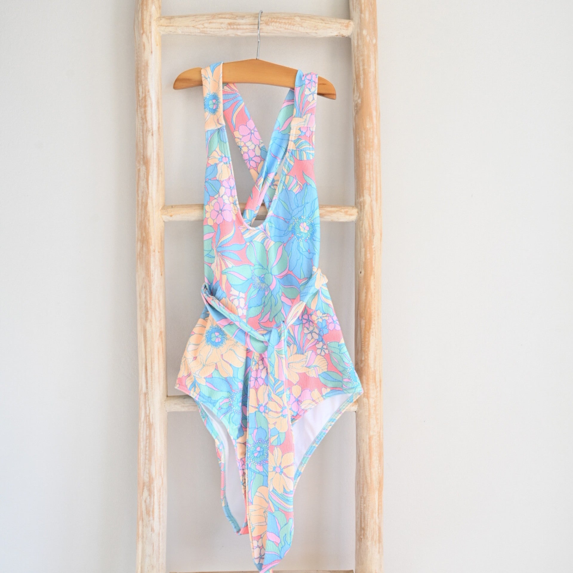 Our Floral Print Swimsuit features a beautiful floral pattern and versatile crossback straps that can be tied at the back or front for a chic bow detail. Designed with removable cups for customizable support, this swimsuit not only enhances your silhouette but also offers comfort and style.