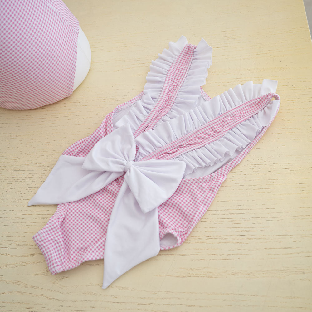 Classic and timeless, this swimsuit features a charming pink gingham pattern and a crisp white bow at the back. The ruffled straps add an extra touch of elegance and ensure a secure fit. Made in Portugal