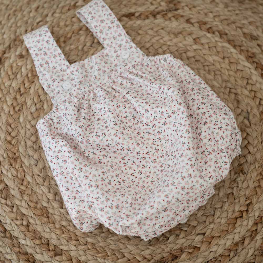 A practical and versatile romper with straps, perfect for any season. Pair it with a long-sleeve shirt and a knit cardigan on cooler days, or wear it with a short-sleeve shirt—or even on its own—during warm summer days. Available in various patterns.