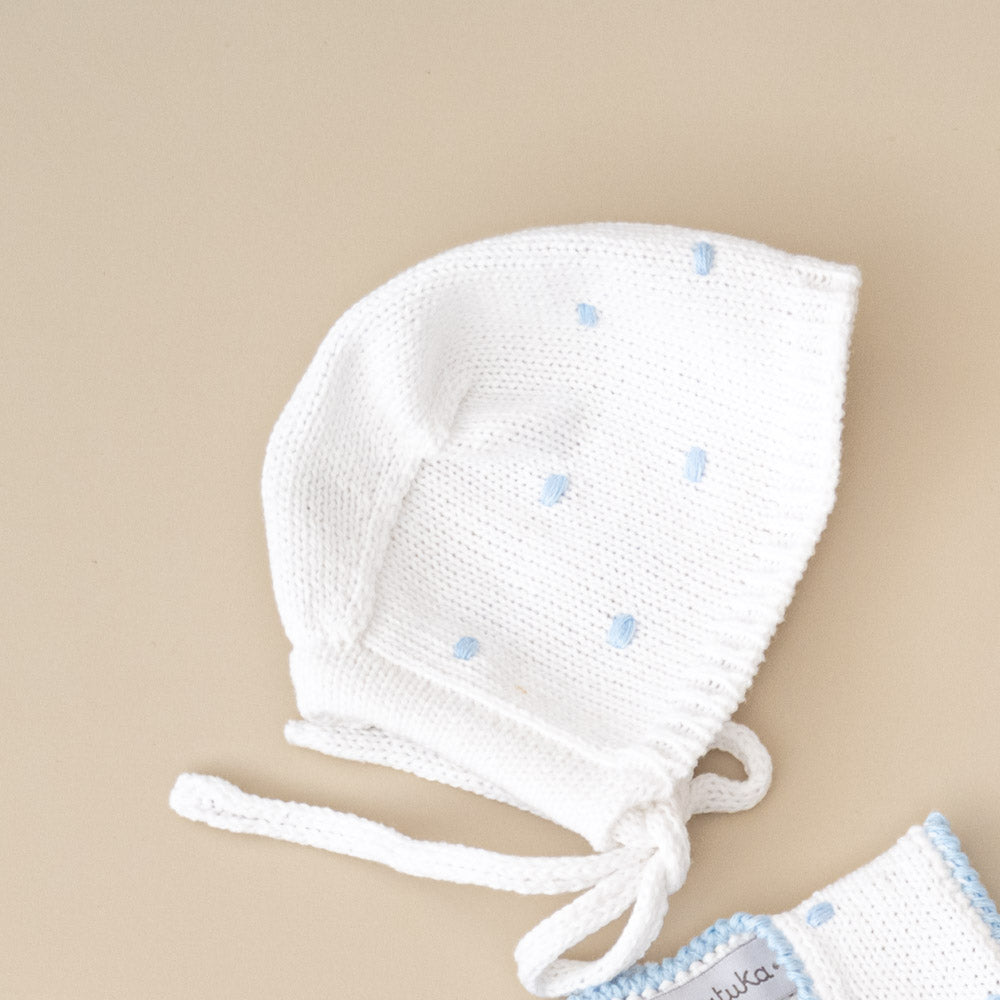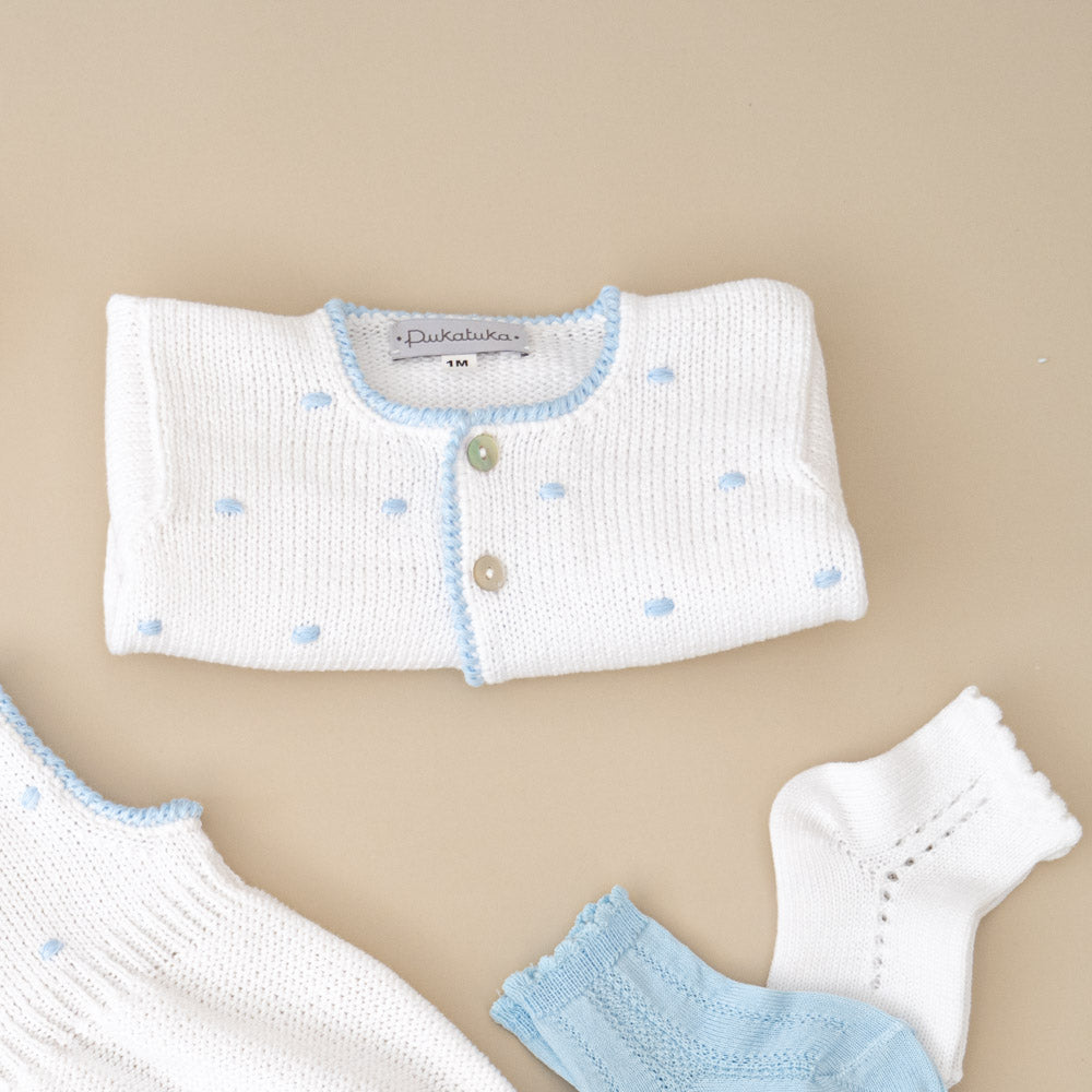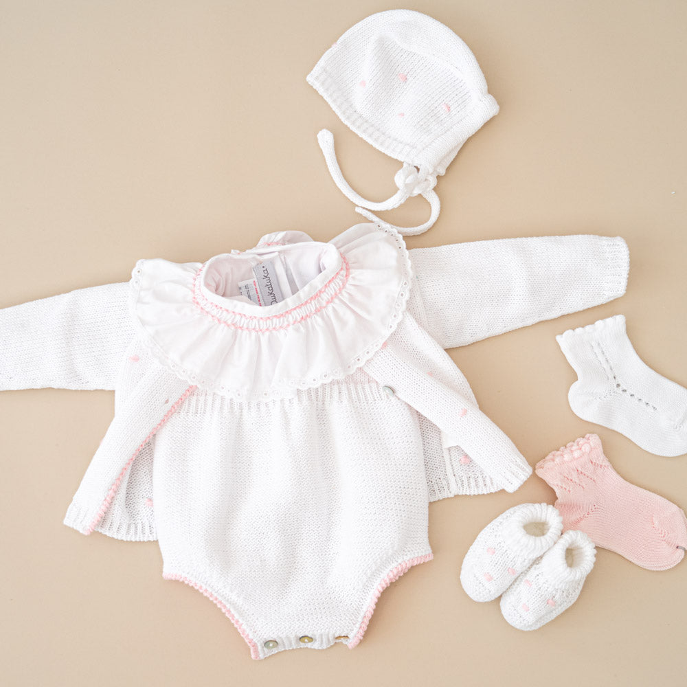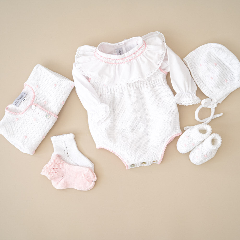 This high-quality knitted cotton romper features delicate hand-embroidered polka dots and contrasting trims on the legs and arms. Crafted from 100% premium Italian yarn, it offers exceptional softness and durability. Perfect for comfortable, stylish days—produced with care in Portugal. Complete the look with our matching cardigan, bonnet, and booties from the same collection for the perfect outfit. For an even more stylish ensemble, you can add a shirt or bodysuit with a collar to create a look that's even more charming and polished.