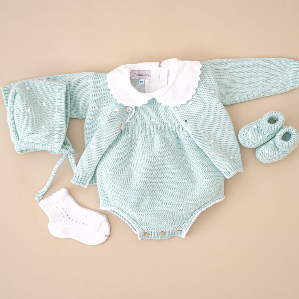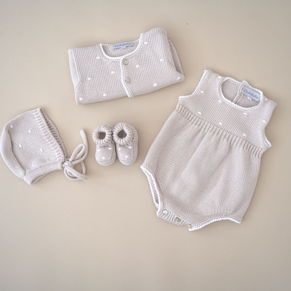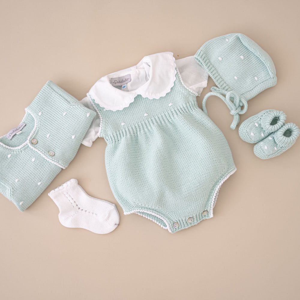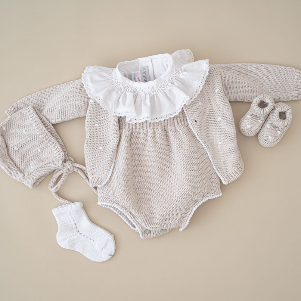 This high-quality knitted cotton romper features delicate hand-embroidered polka dots and contrasting trims on the legs and arms. Crafted from 100% premium Italian yarn, it offers exceptional softness and durability. Perfect for comfortable, stylish days—produced with care in Portugal. Complete the look with our matching cardigan, bonnet, and booties from the same collection for the perfect outfit. For an even more stylish ensemble, you can add a shirt or bodysuit with a collar to create a look that's even more charming and polished.