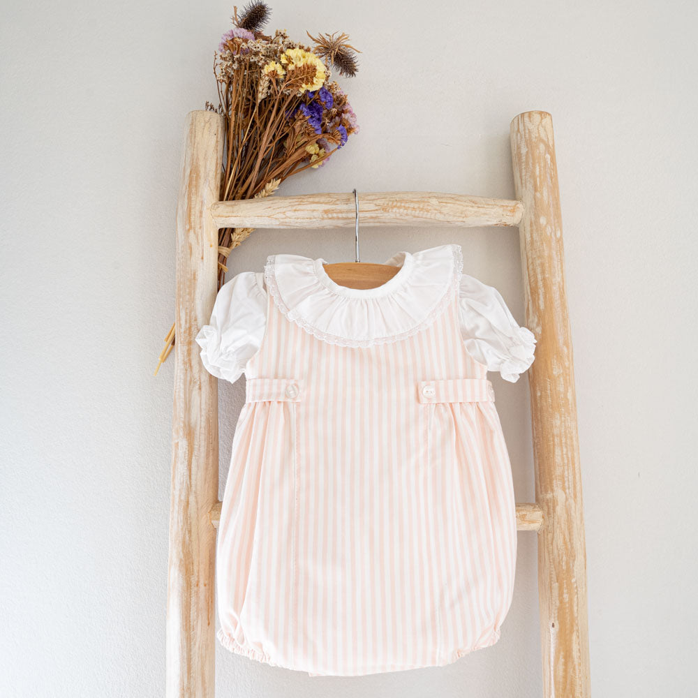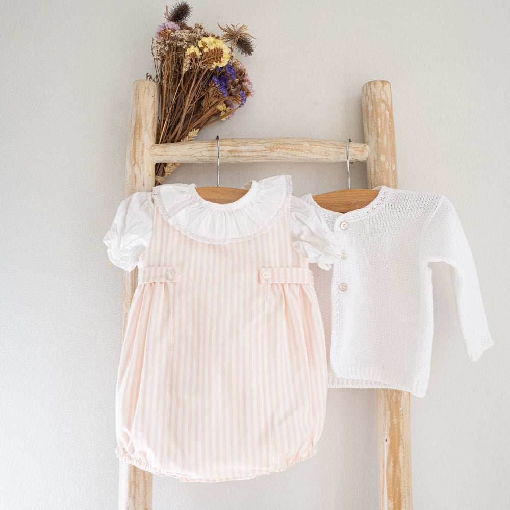 Sleeveless baby romper with a classic striped pattern and side strap detail. A versatile piece perfect for year-round wear – layer it with a shirt and cardigan on cooler days or wear it on its own in warmer weather. Fully lined, made from 100% cotton and crafted in Portugal.