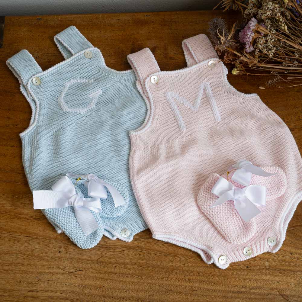 Baby romper knitted in high-quality Italian yarn, incredibly soft and gentle on delicate skin. Features a contrasting trim and a customizable hand-embroidered initial for a truly unique piece. Choose your preferred color and add the desired initial in the checkout notes. Made-to-order item, not eligible for exchange or return. Made in Portugal.