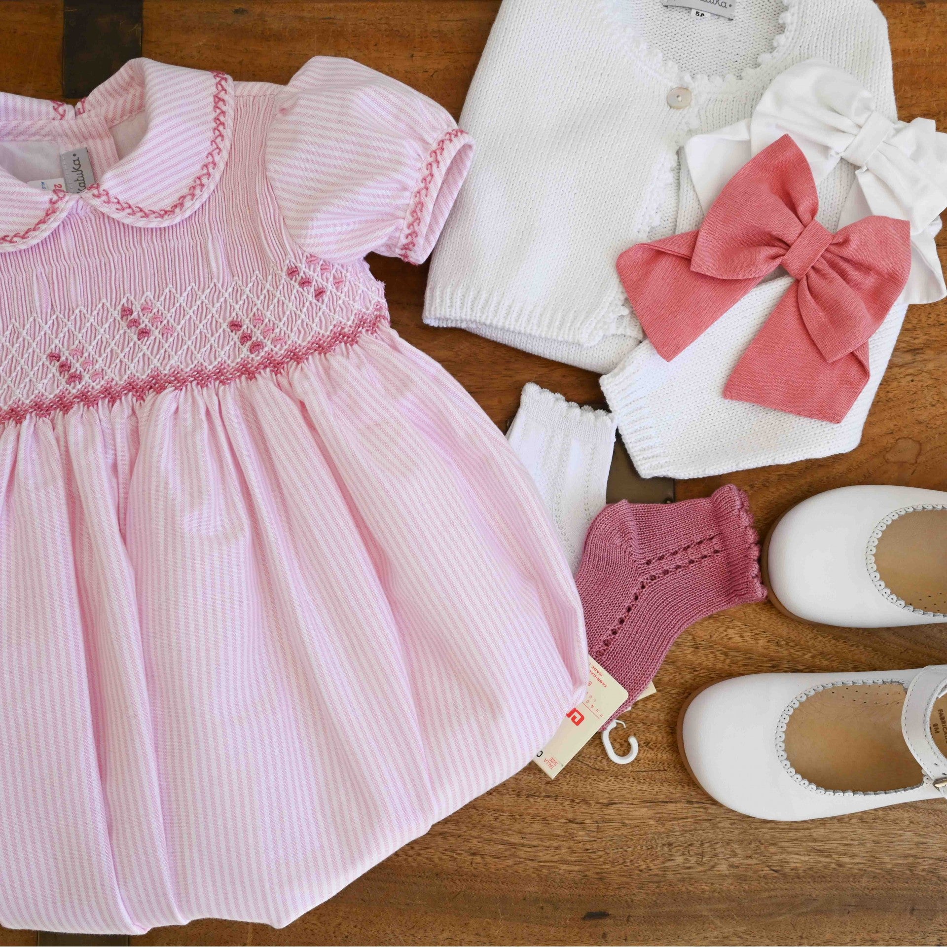 Fôfo com padrão de riscas rosa e favos bordados à mão no peito e gola. Manga balão e cinto que aperta atrás a dar laço. Forrado. 100% algodão e Fabricado em Portugal
