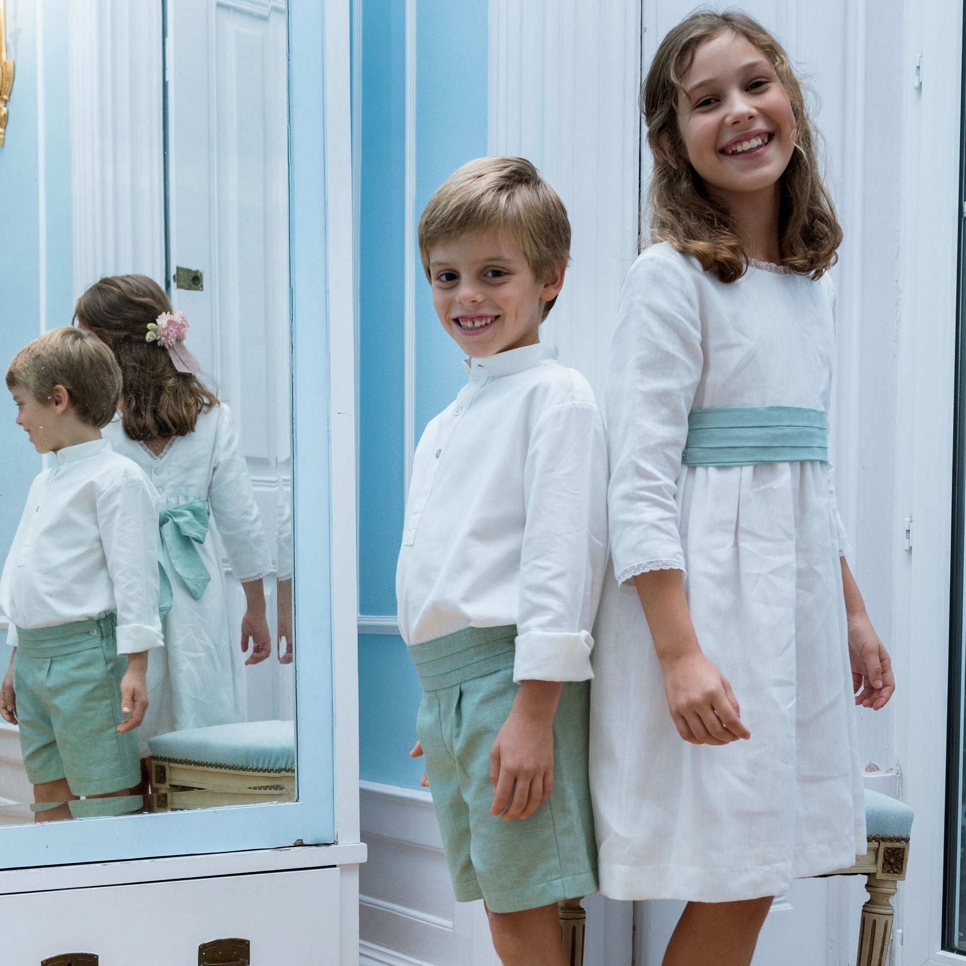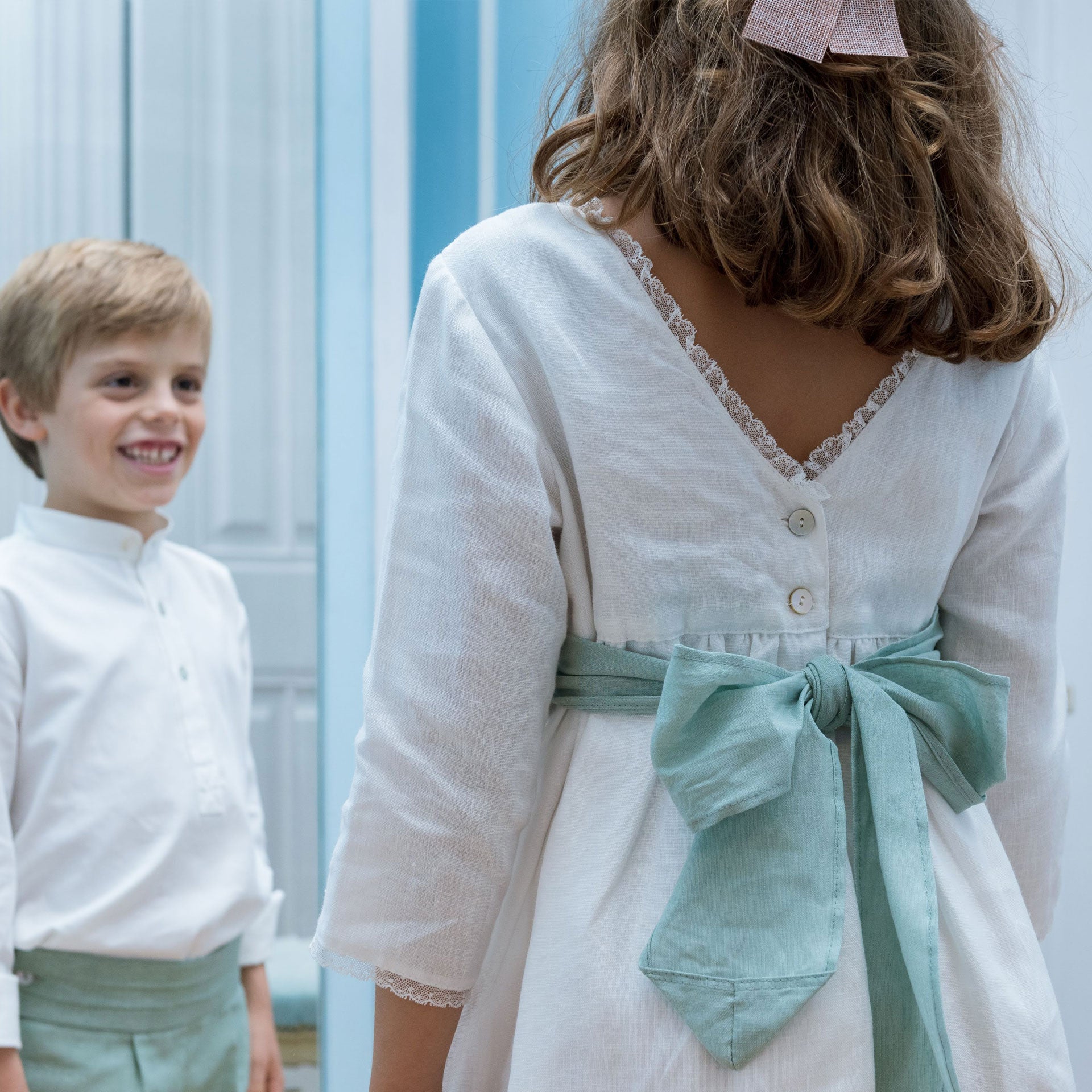 Vestido em linho com decote em V nas costas. Pormenor de rendinha no decote e mangas. Faixa com pregas que aperta atrás a dar laço. Totalmente Forrado. Perfeito para uma cerimónia como um Batizado ou uma Primeira Comunhão. Fabricado em Portugal