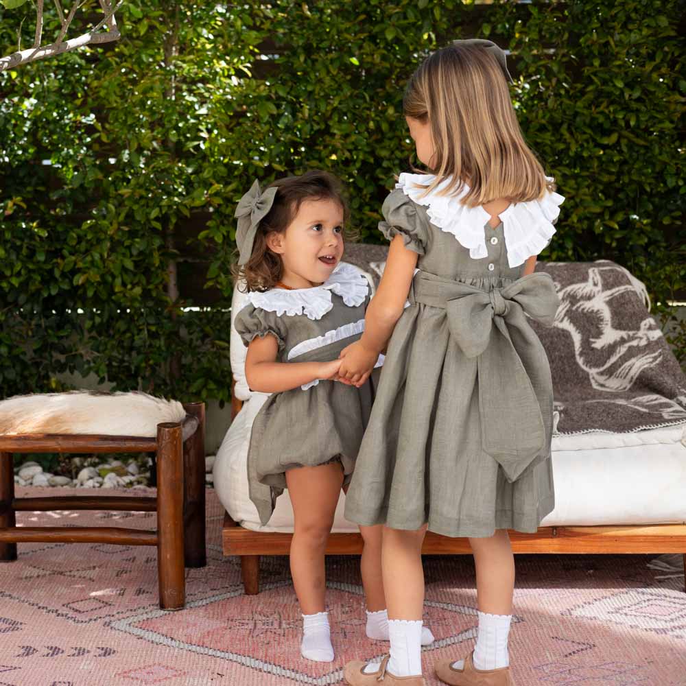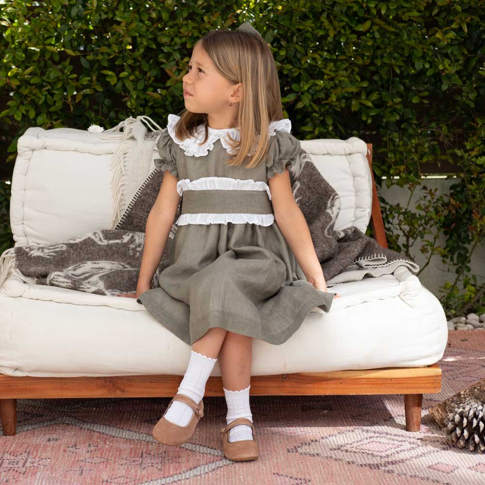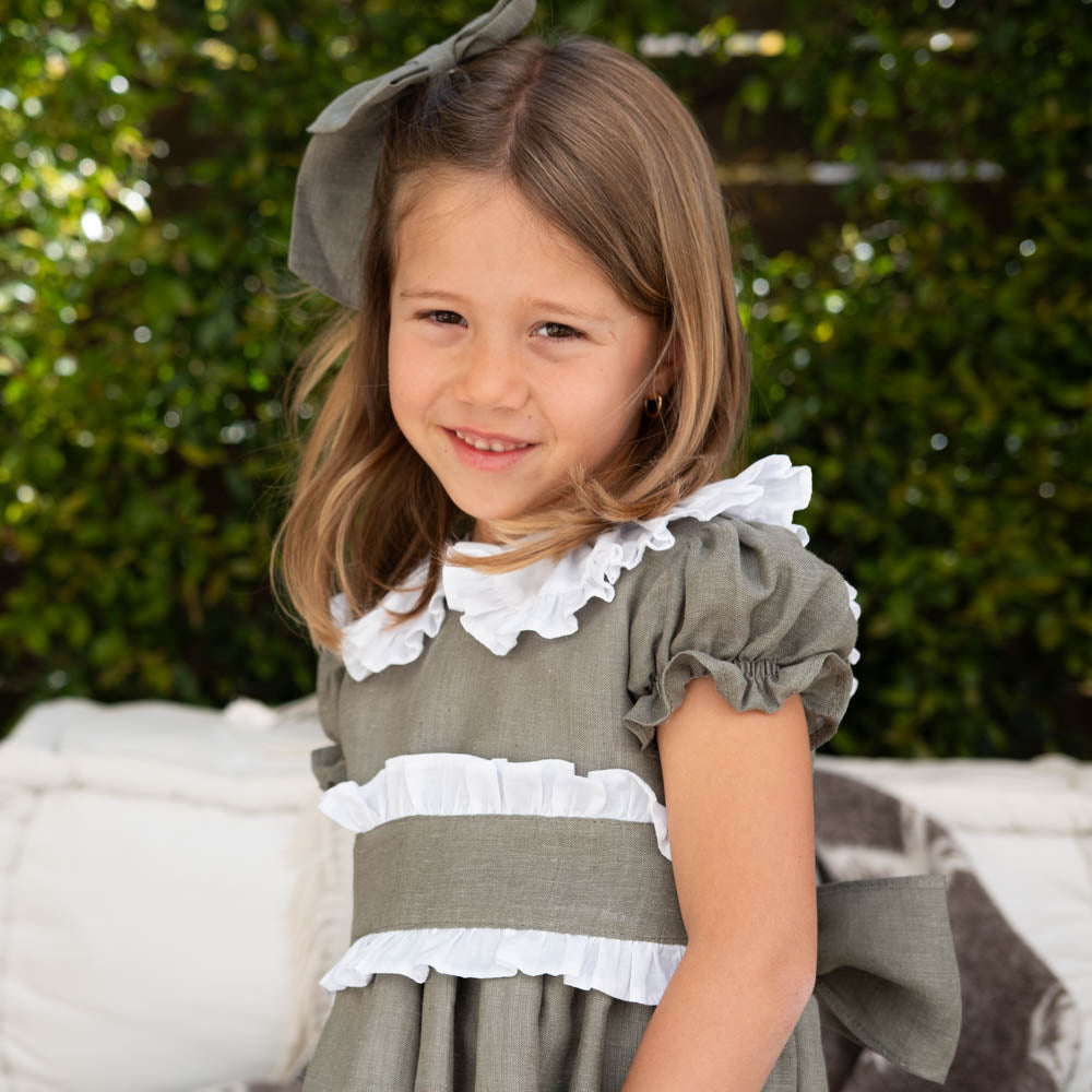 Vestido em linho com gola com folho e faixa com folhinhos que aperta atrás a dar laço. Decote em V nas costas. Forrado. Perfeito para casamento e ocasiões especiais. Forrado. Fabricado em Portugal