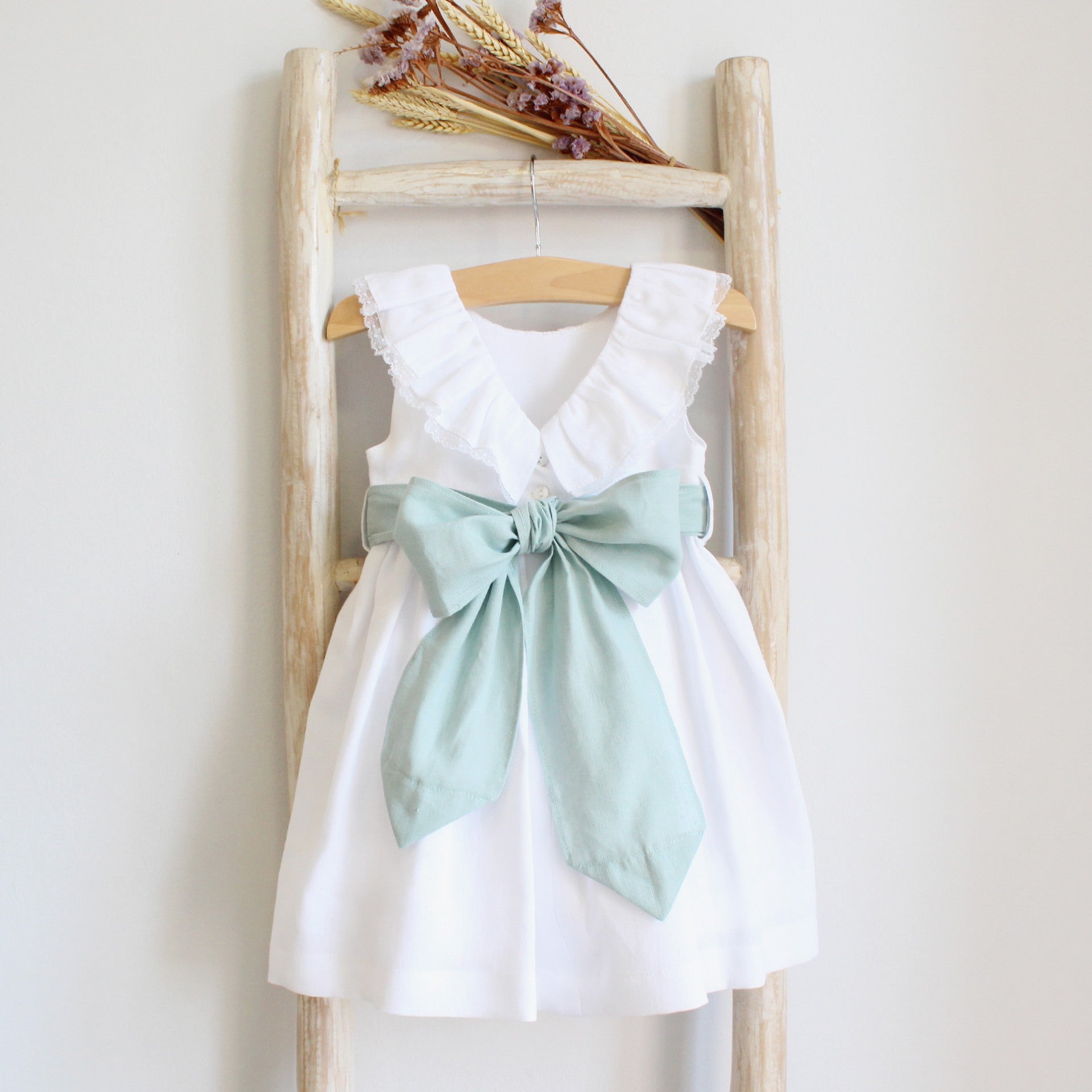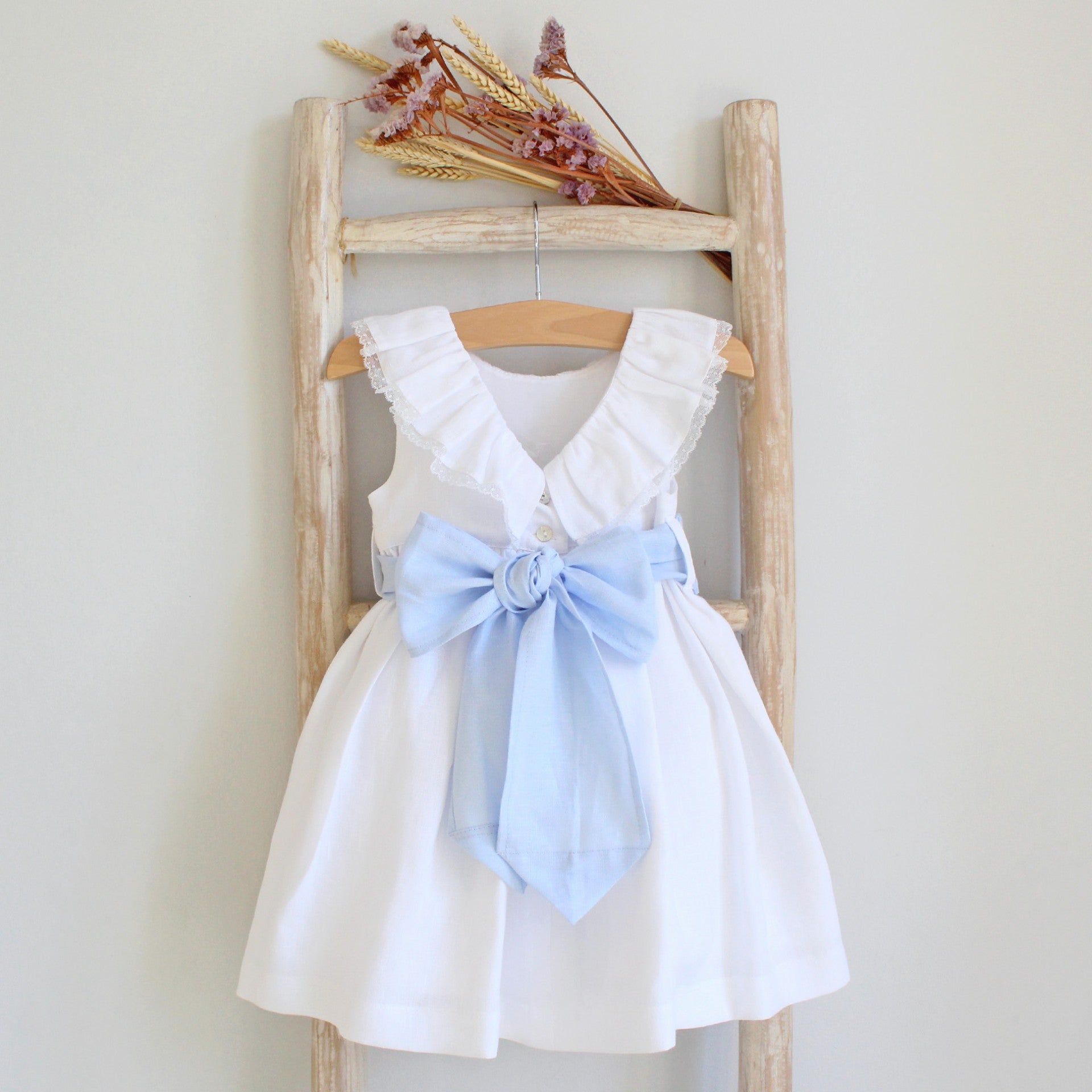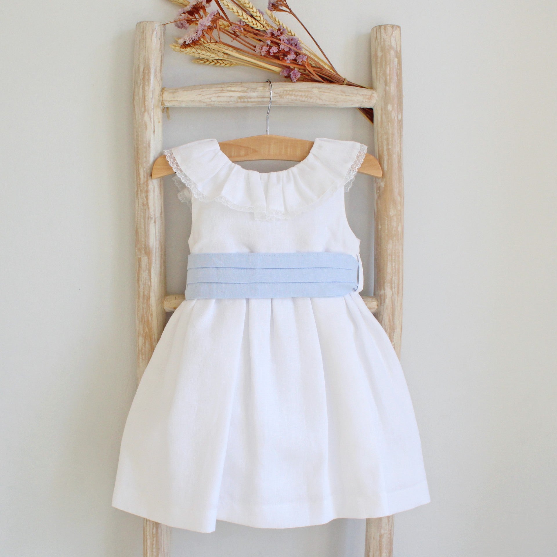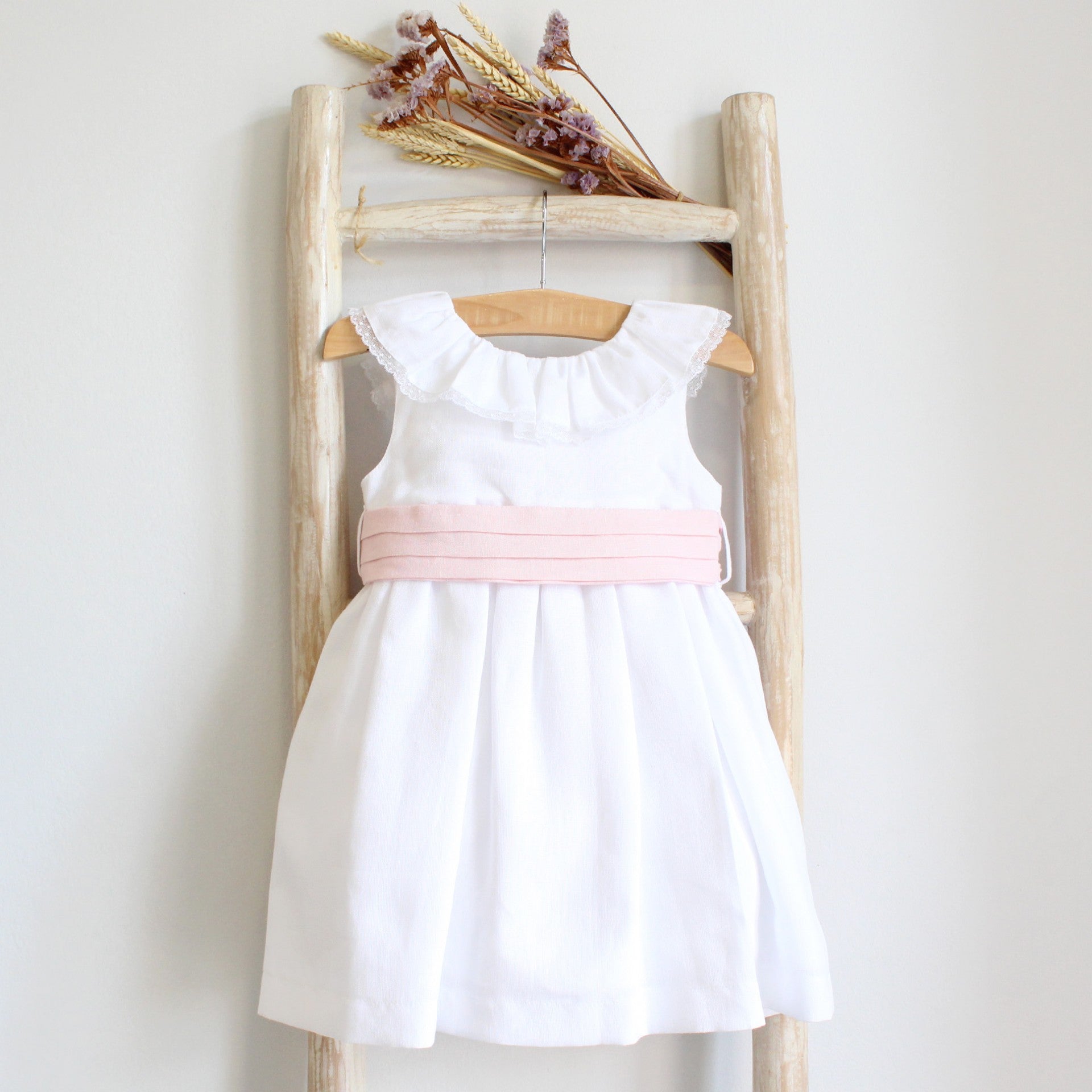Vestido em linho com decote em V nas costas. Pormenor de rendinha na gola. Faixa com pregas que aperta atrás a dar laço. Totalmente Forrado. Perfeito para uma cerimónia como um Batizado ou uma Primeira Comunhão. Fabricado em Portugal