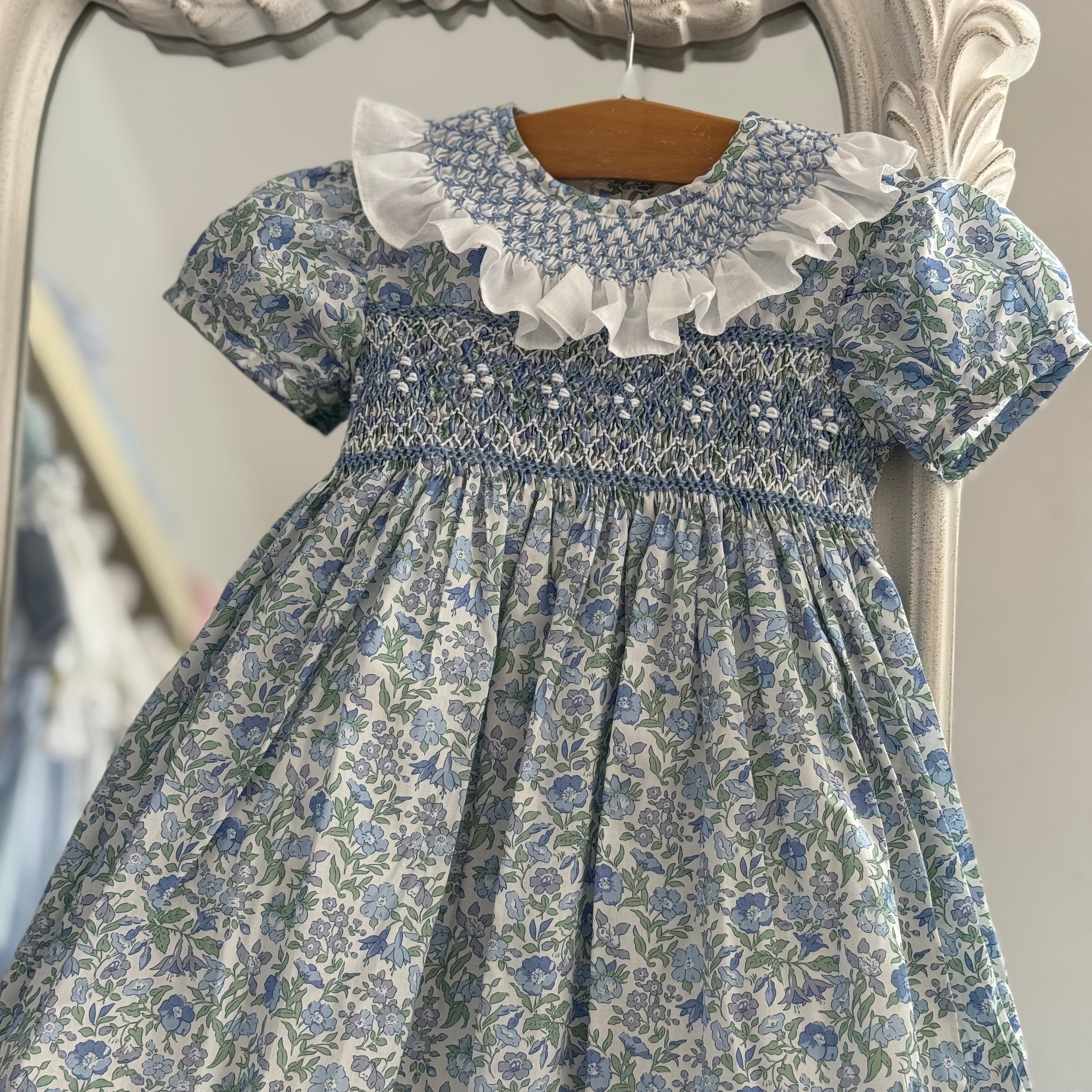 Vestido com padrão de flores em tons de salmão, verde, coral e azul com peito e gola bordados à mão. Tem faixa que aperta atrás a dar laço e é totalmente forrado. Produzido em algodão num tecido suave, é perfeito para um dia mais especial. Feito em Portugal