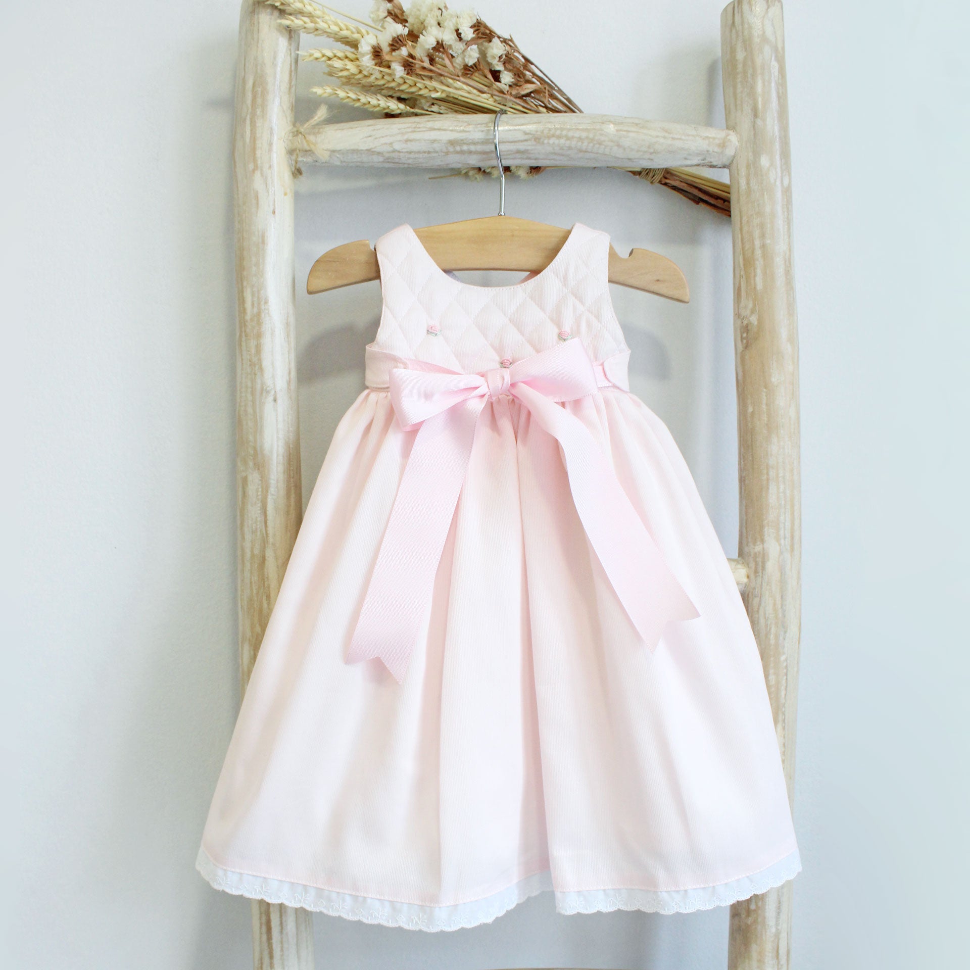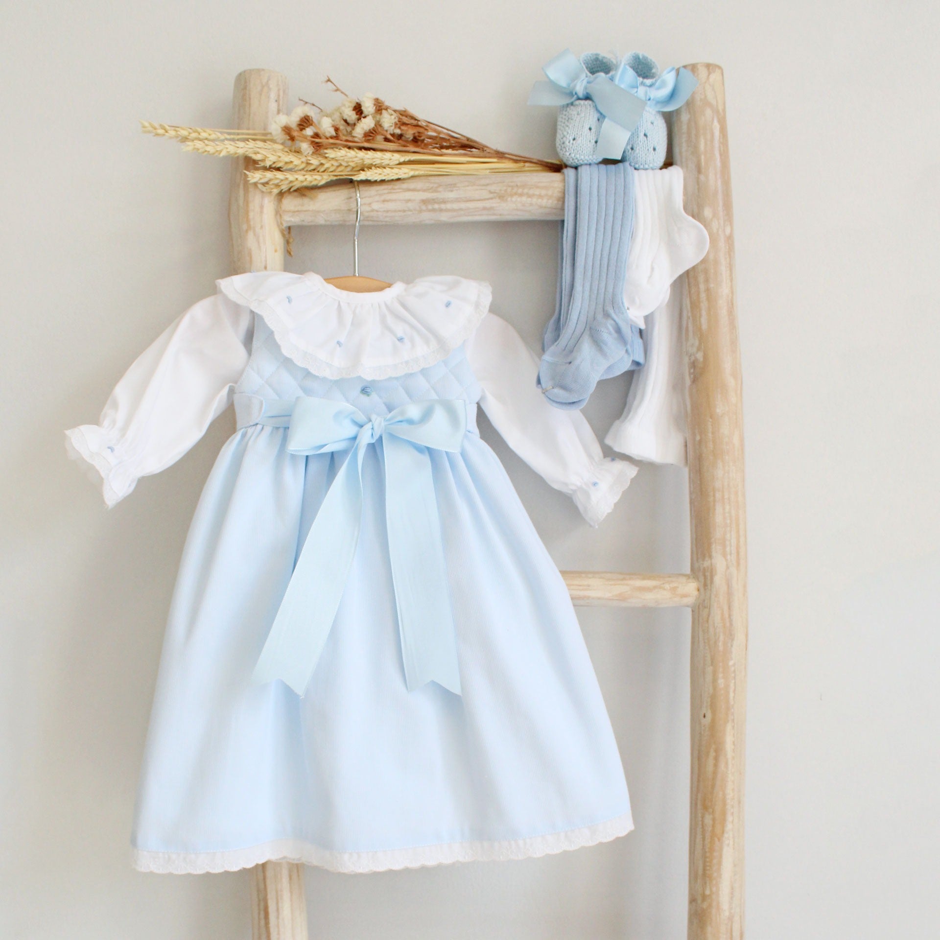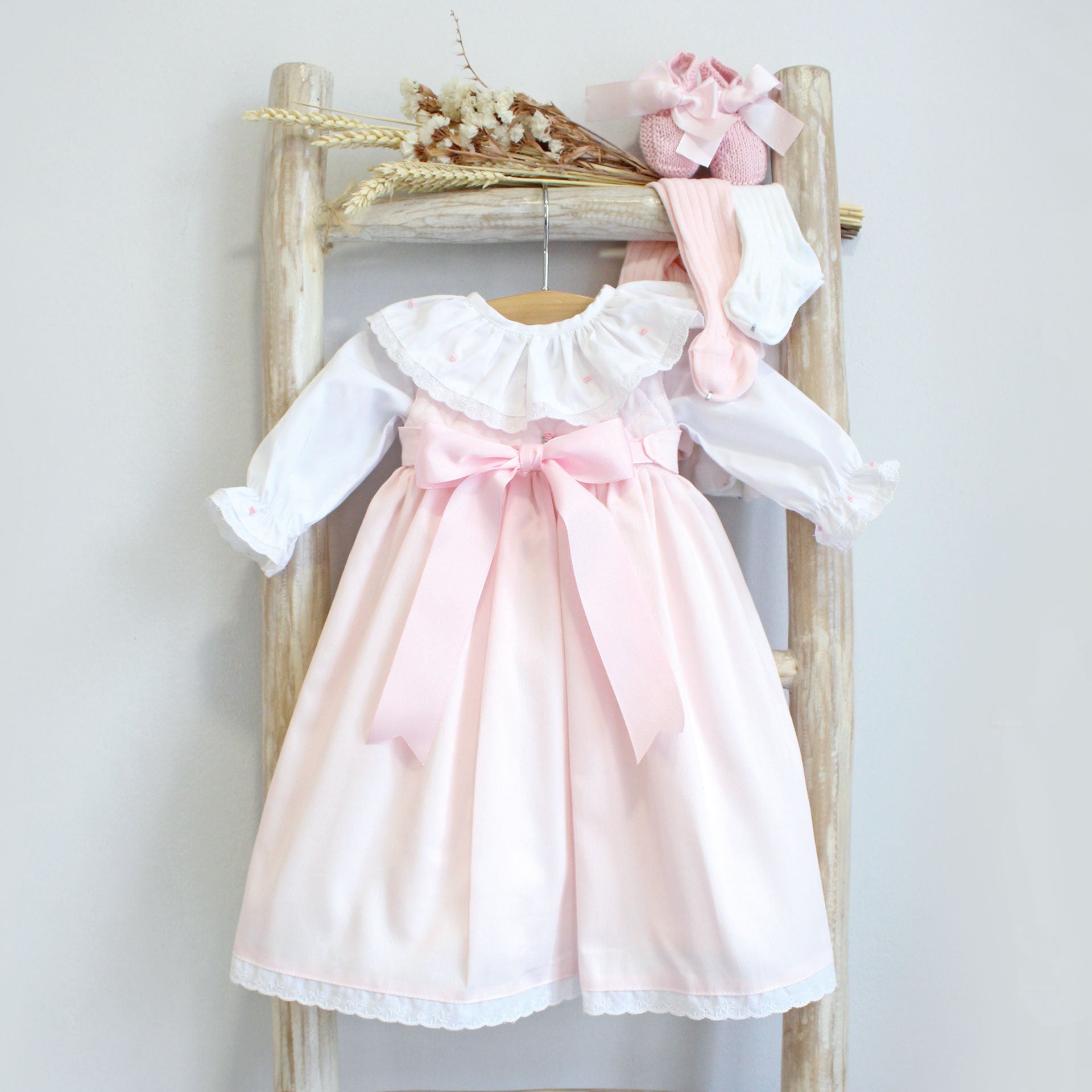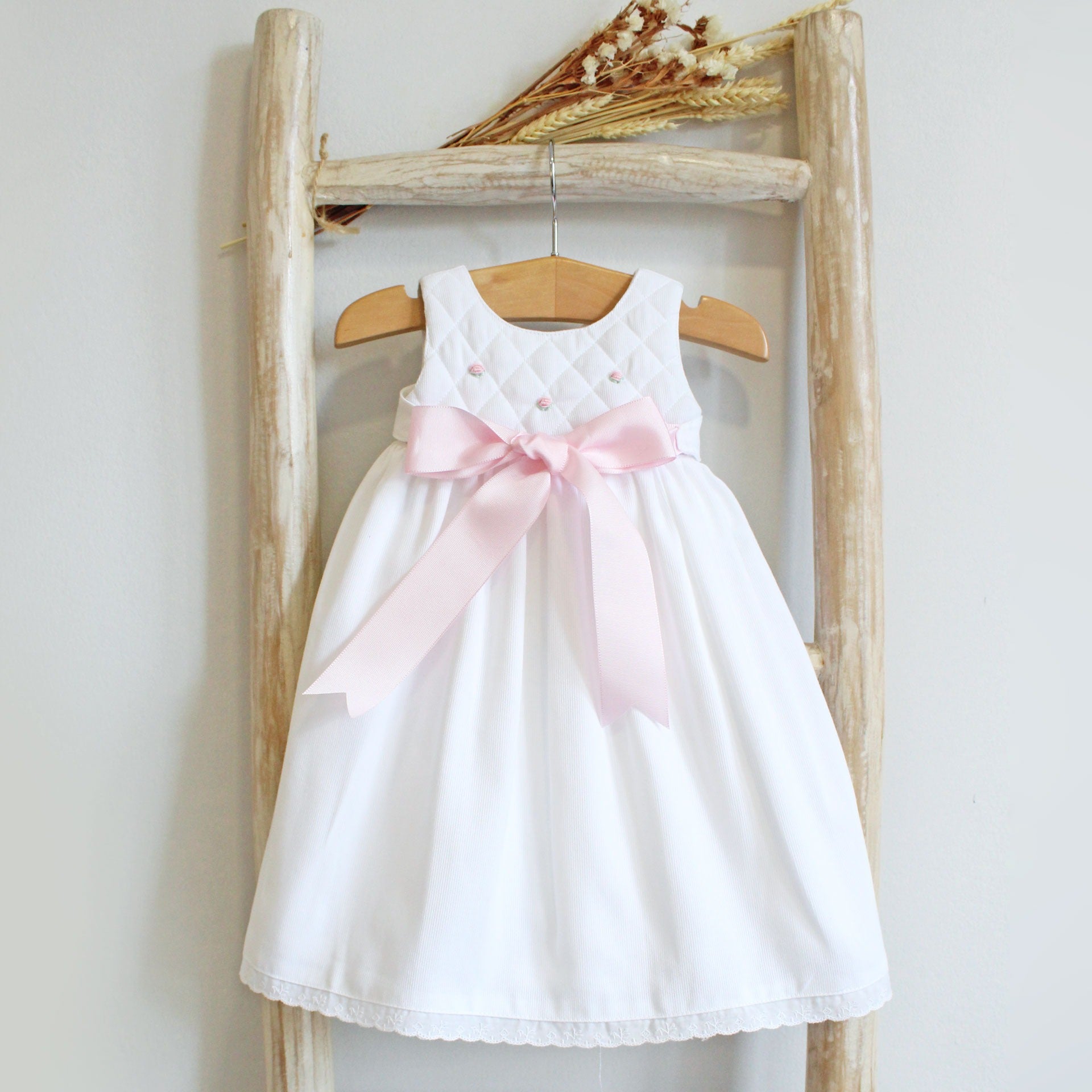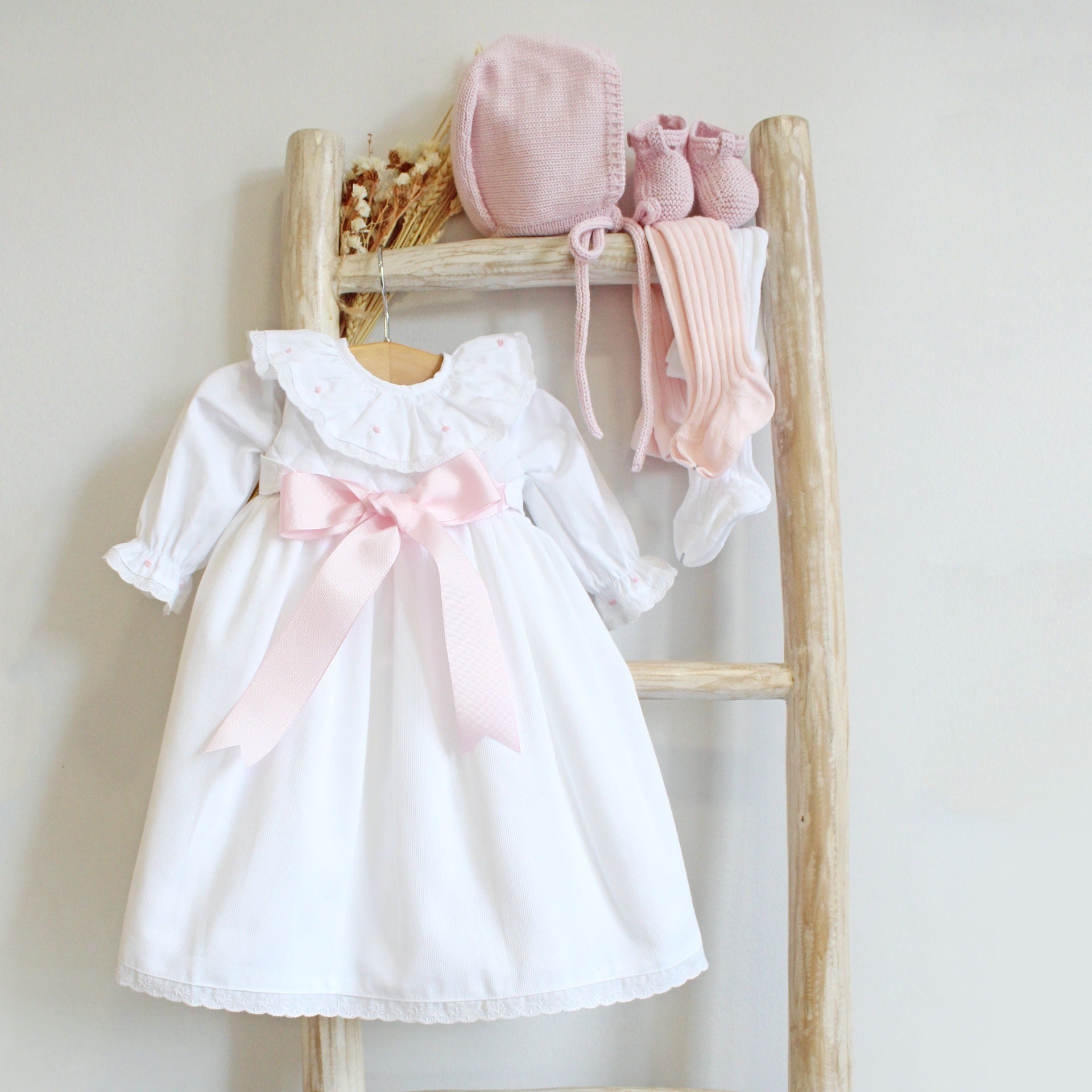 Cueiro clássico com detalhe de rosas bordadas à mão no peito e laço que permite ajustar o tamanho. Complete o look com uma camisa bordada e se necessário, casaco de malha, touca, collants e botinhas. 100% algodão e Fabricado em Portugal