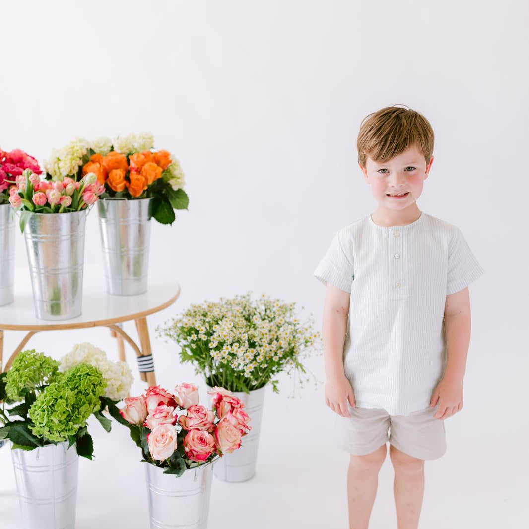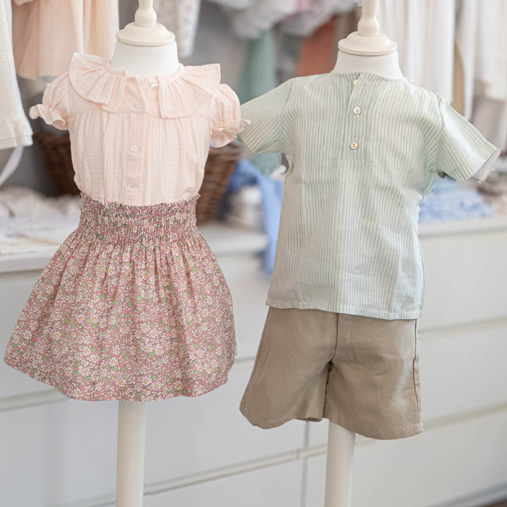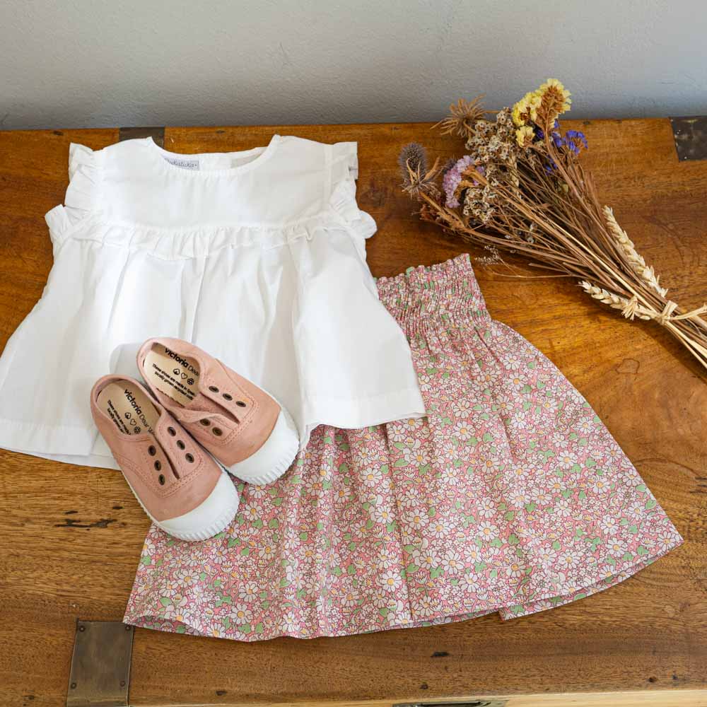 Elegant and practical skirt for girls, featuring a delicate Liberty daisy print in shades of pink. Designed with an elastic waistband for comfort and ease of wear. Fully lined for a perfect finish. Made in Portugal.