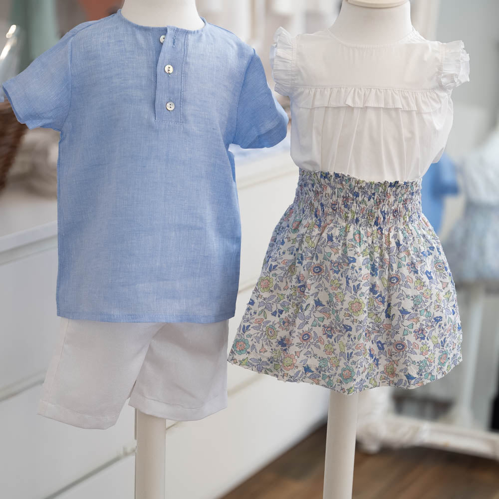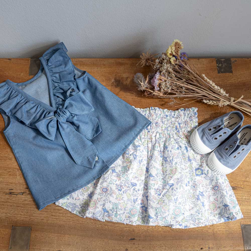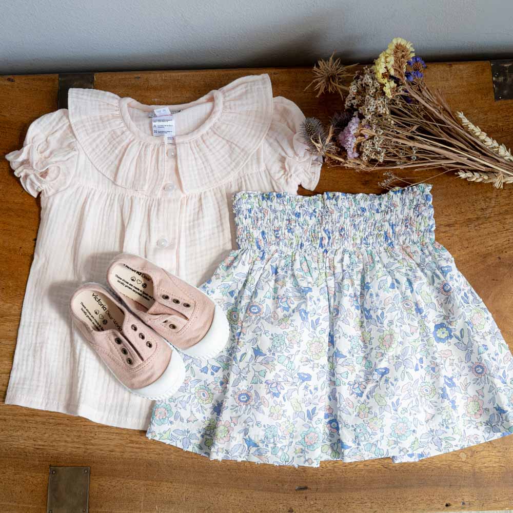 Elegant and practical skirt for girls, featuring a delicate floral print in shades of pink and blue. Designed with an elastic waistband for comfort and ease of wear. Fully lined for a perfect finish. Made in Portugal.