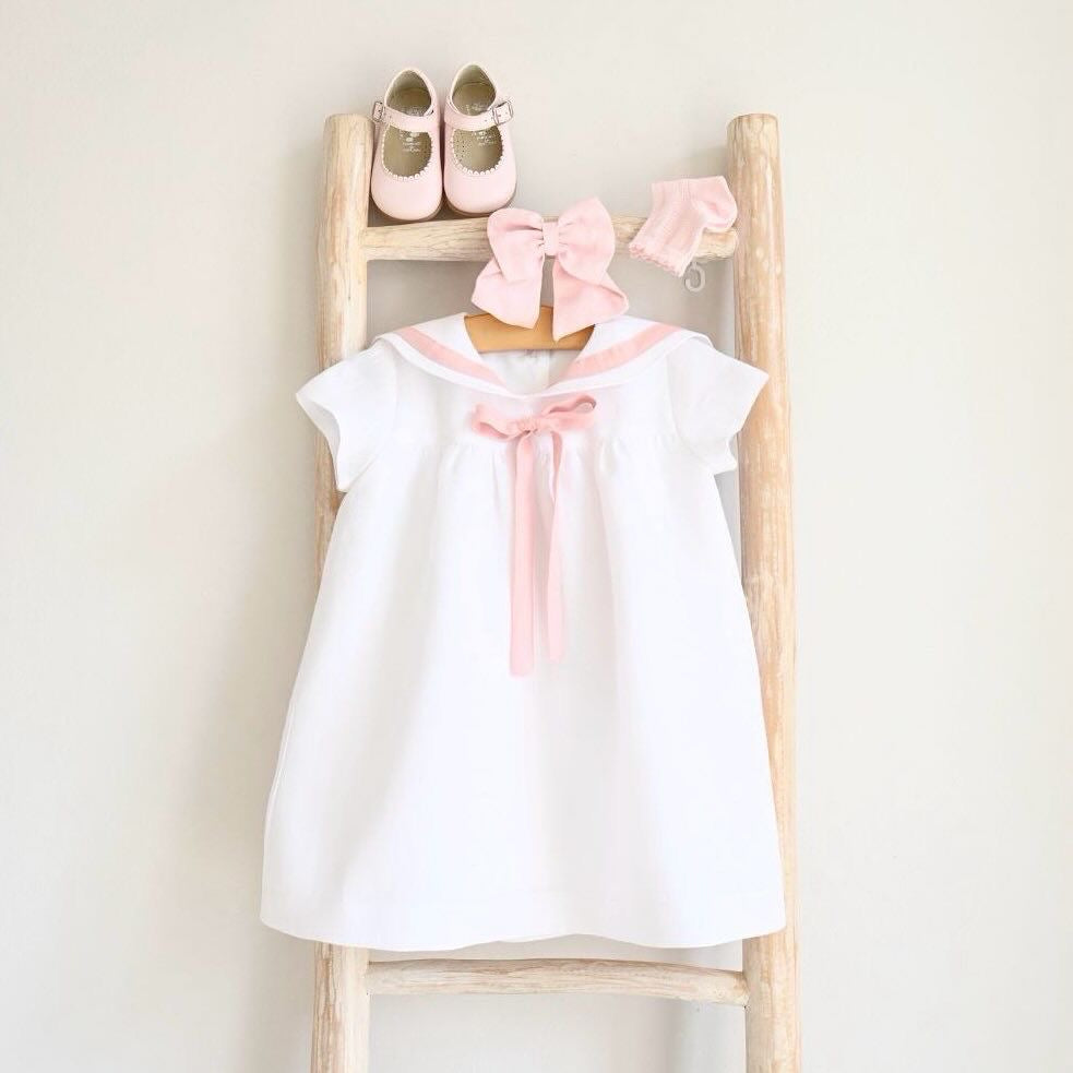 This beautiful linen dress for girls features a classic sailor-inspired design, perfect for a timeless and charming look. Fully lined for added comfort and quality. Crafted with care in Portugal, ideal for special occasions or elegant everyday wear.