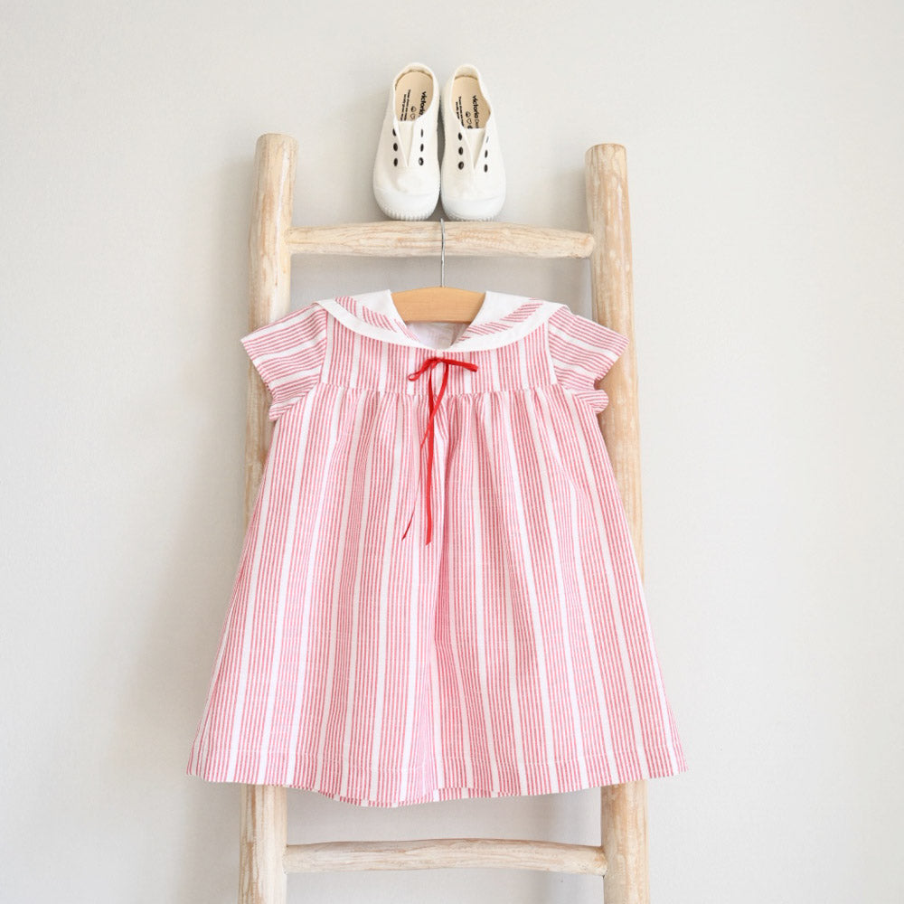 This charming girls' Dress features classic red and white stripes, inspired by nautical style. It has a crisp white sailor collar with a delicate bow at the front, adding a sweet and maritime touch. Fully lined for extra comfort and durability. Crafted with care in Portugal, combining high-quality materials and timeless design. Perfect for casual outings or special occasions, offering a stylish and comfortable look for your little girl.