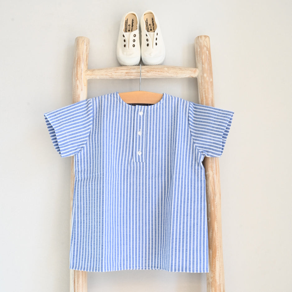 A classic boys' shirt crafted from 100% cotton featuring blue and white stripes. Comfortable, lightweight, and perfect for warm days. Made with care in Portugal, ideal for casual or summery looks.