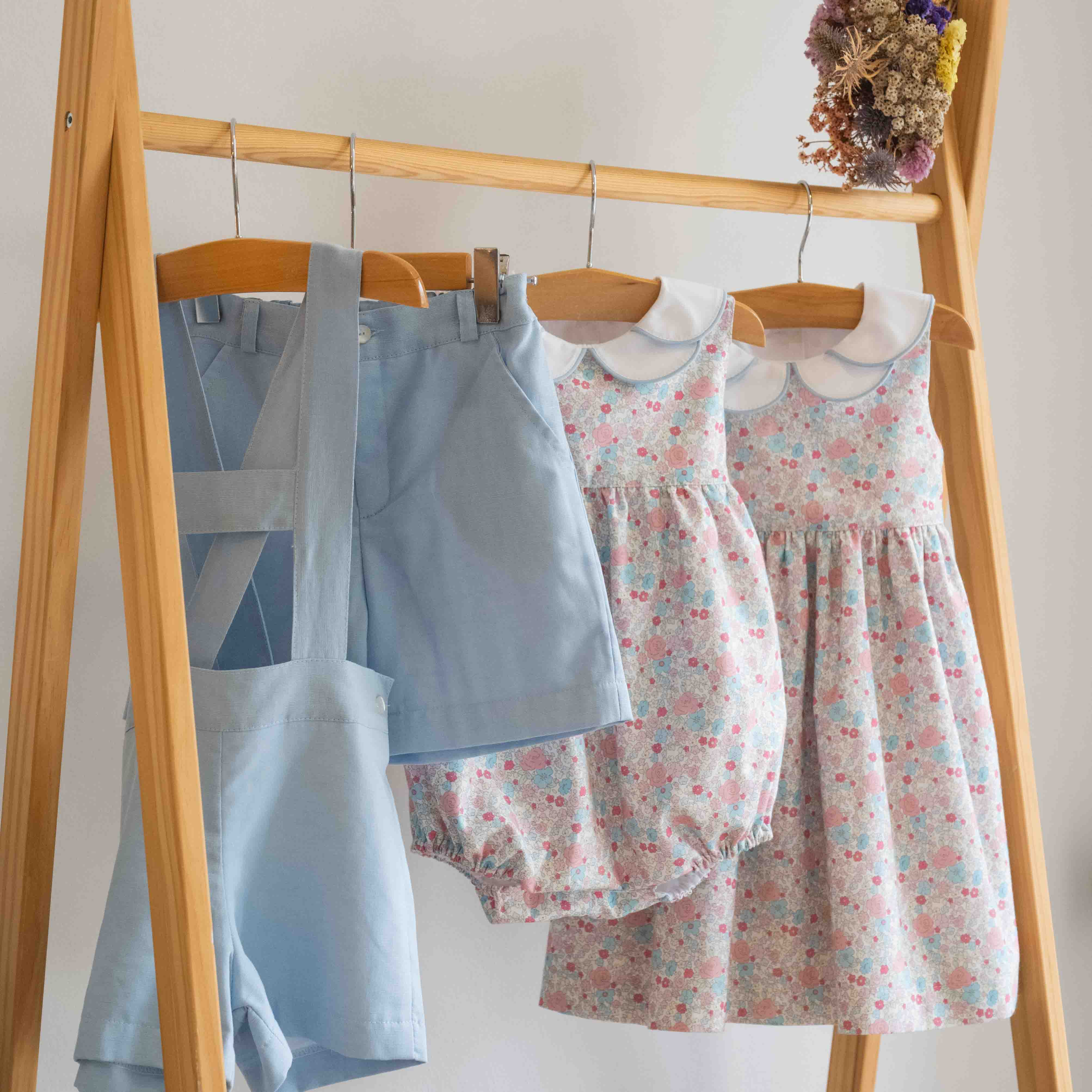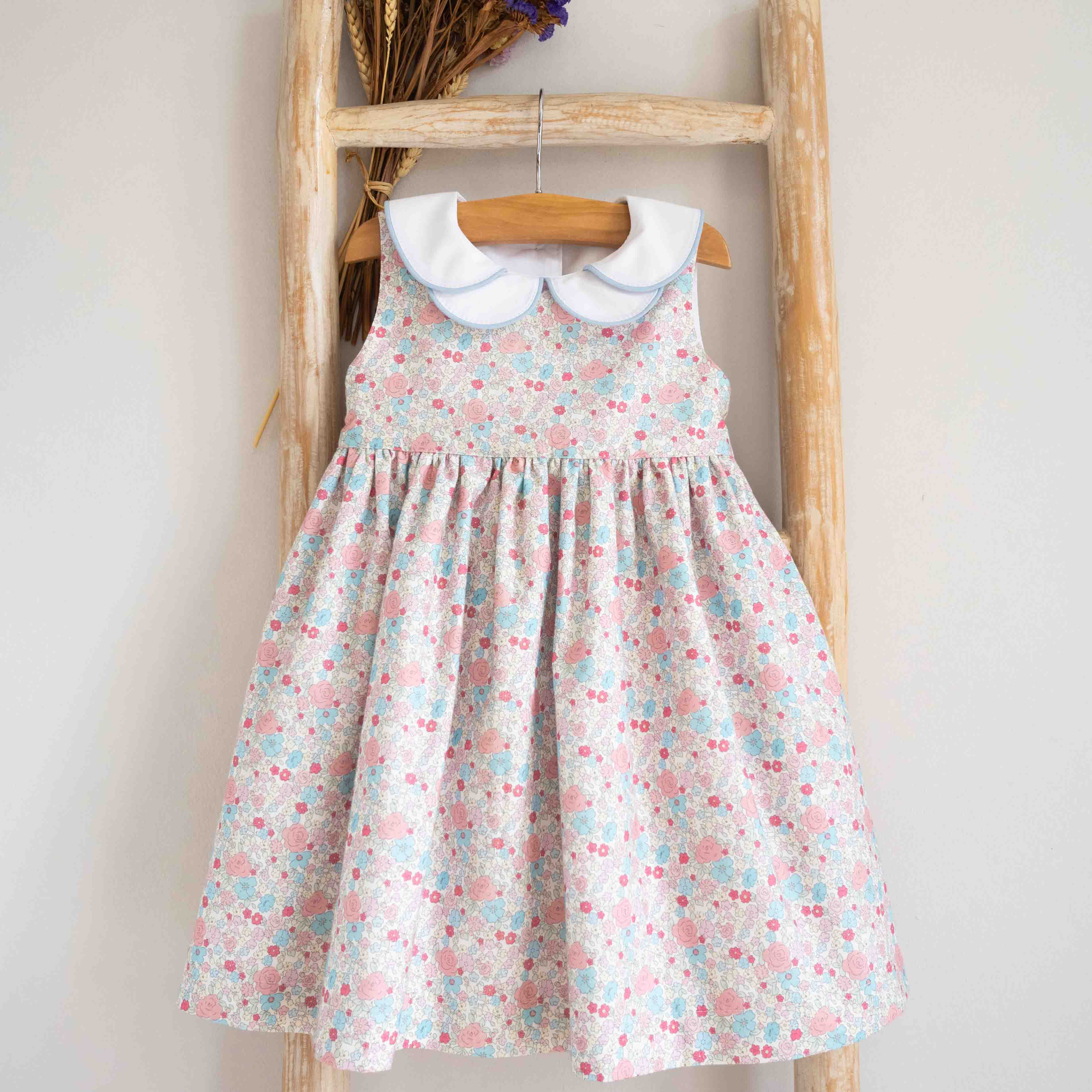 Vestido com padrão de flores e golas sobrepostas com vivo. Aperta atrás com cinto a dar laço. Fabricado em Portugal