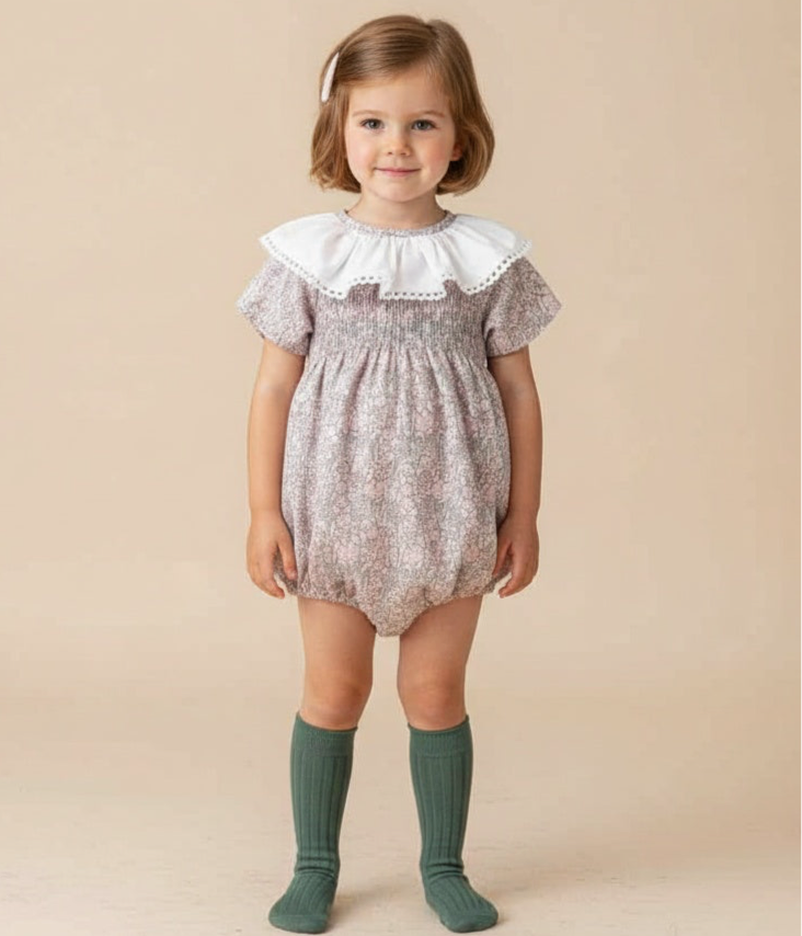Girls Floral Romper in Plumeti Fabric with Lace-Trimmed Collar