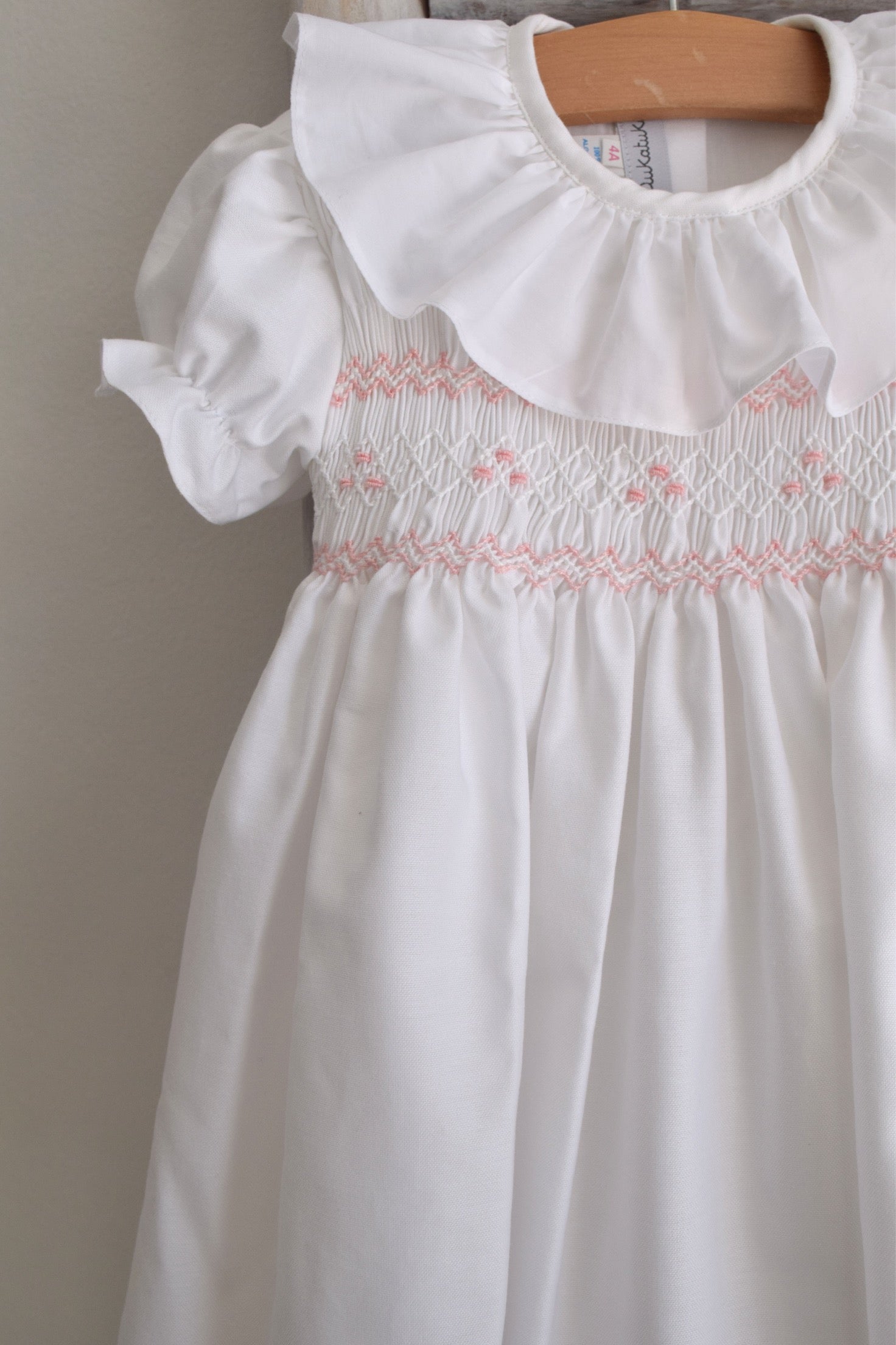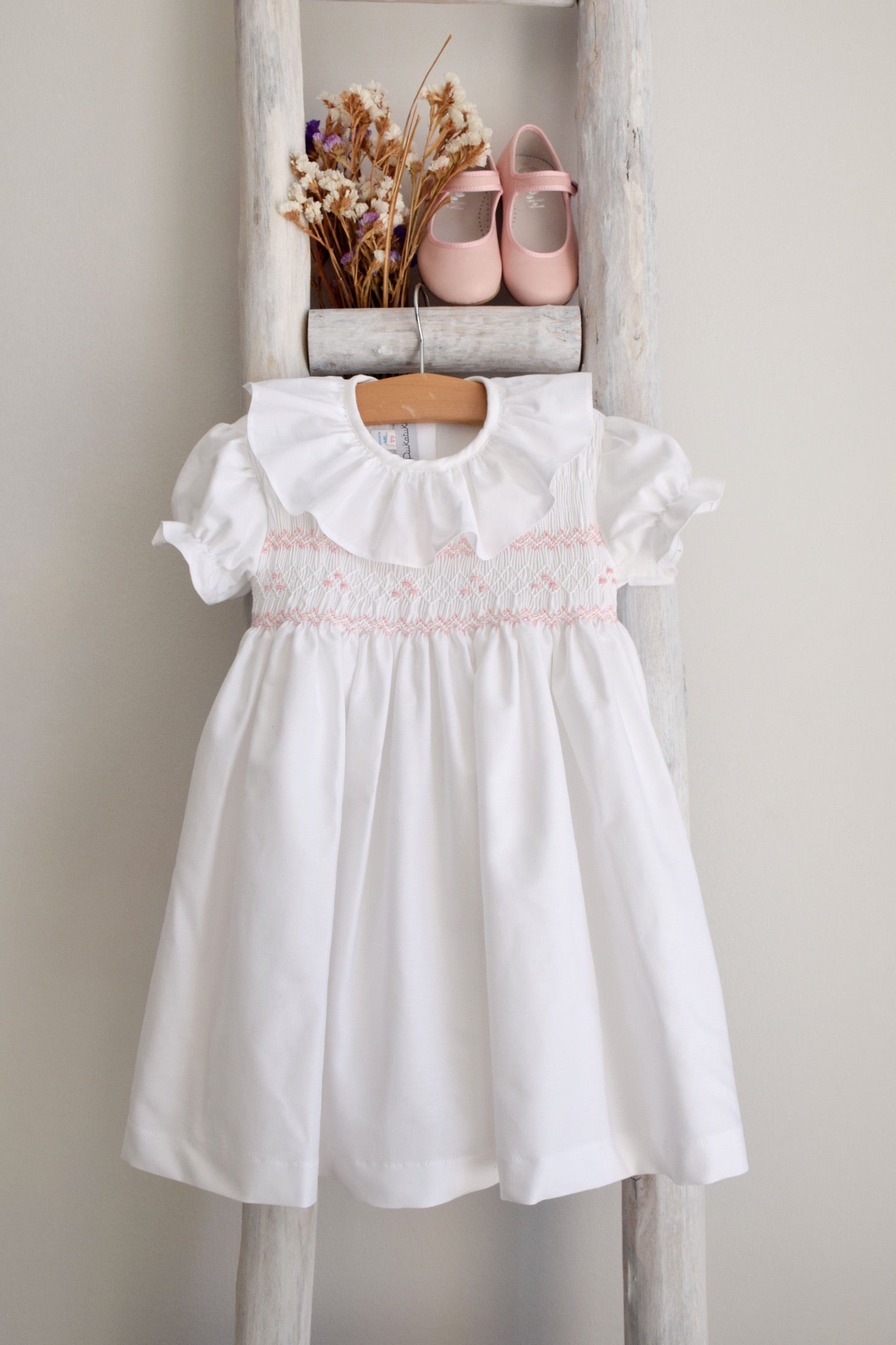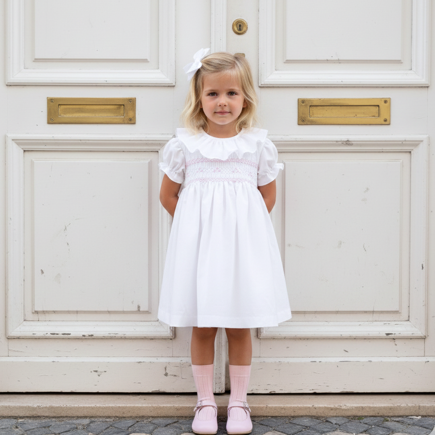 White Smocked Dress with ruffle collar and light pink hand embroidery on chest featuring a sash that ties into a bow at the back. Fully Lined. 100% cotton. Made in Portugal