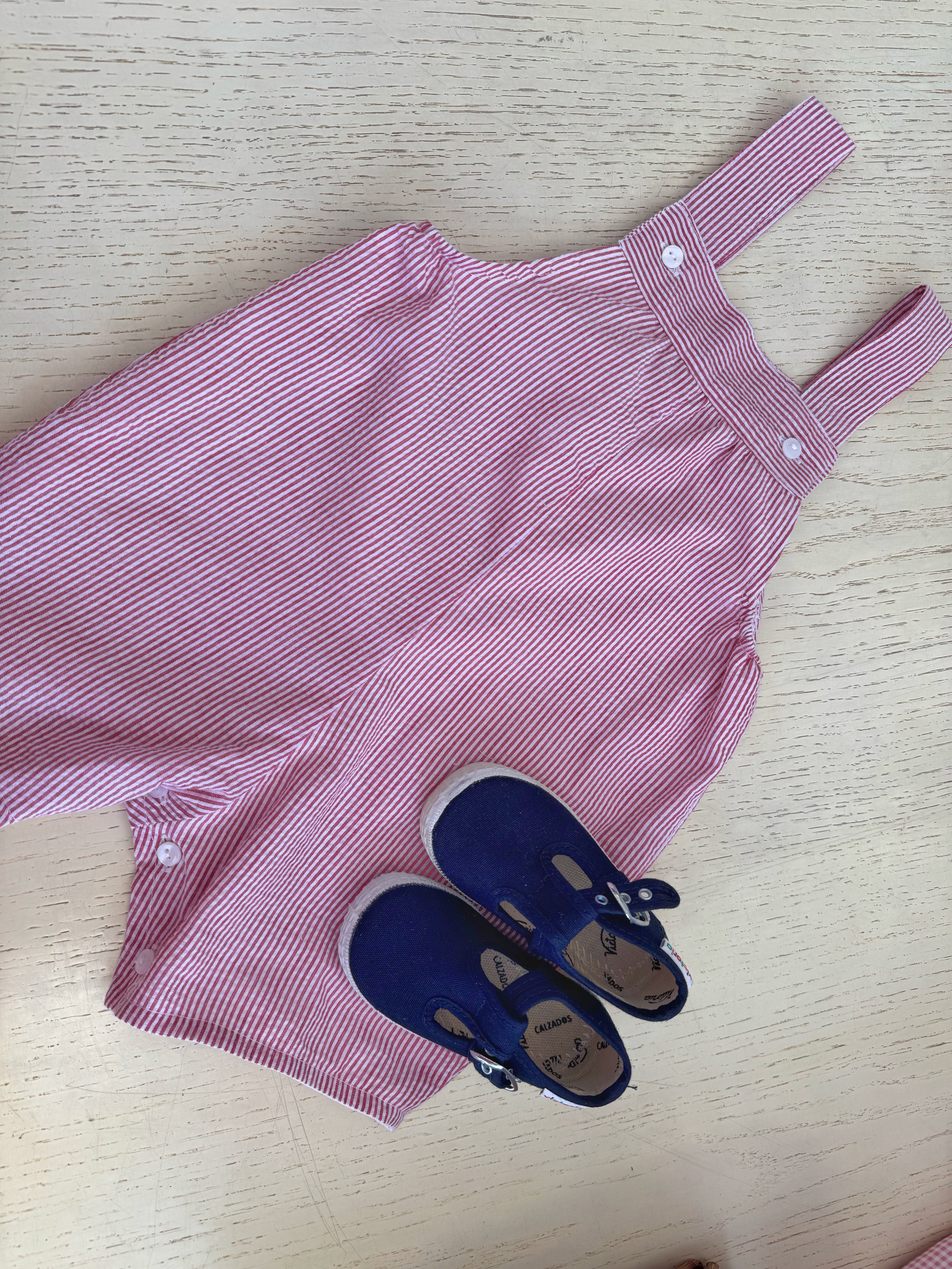 Leichter und vielseitiger kurzer Overall mit klassischem blau-rotem Streifenmuster. Komplett gefüttert für mehr Komfort und perfekt für warme Tage. Hergestellt in Portugal.