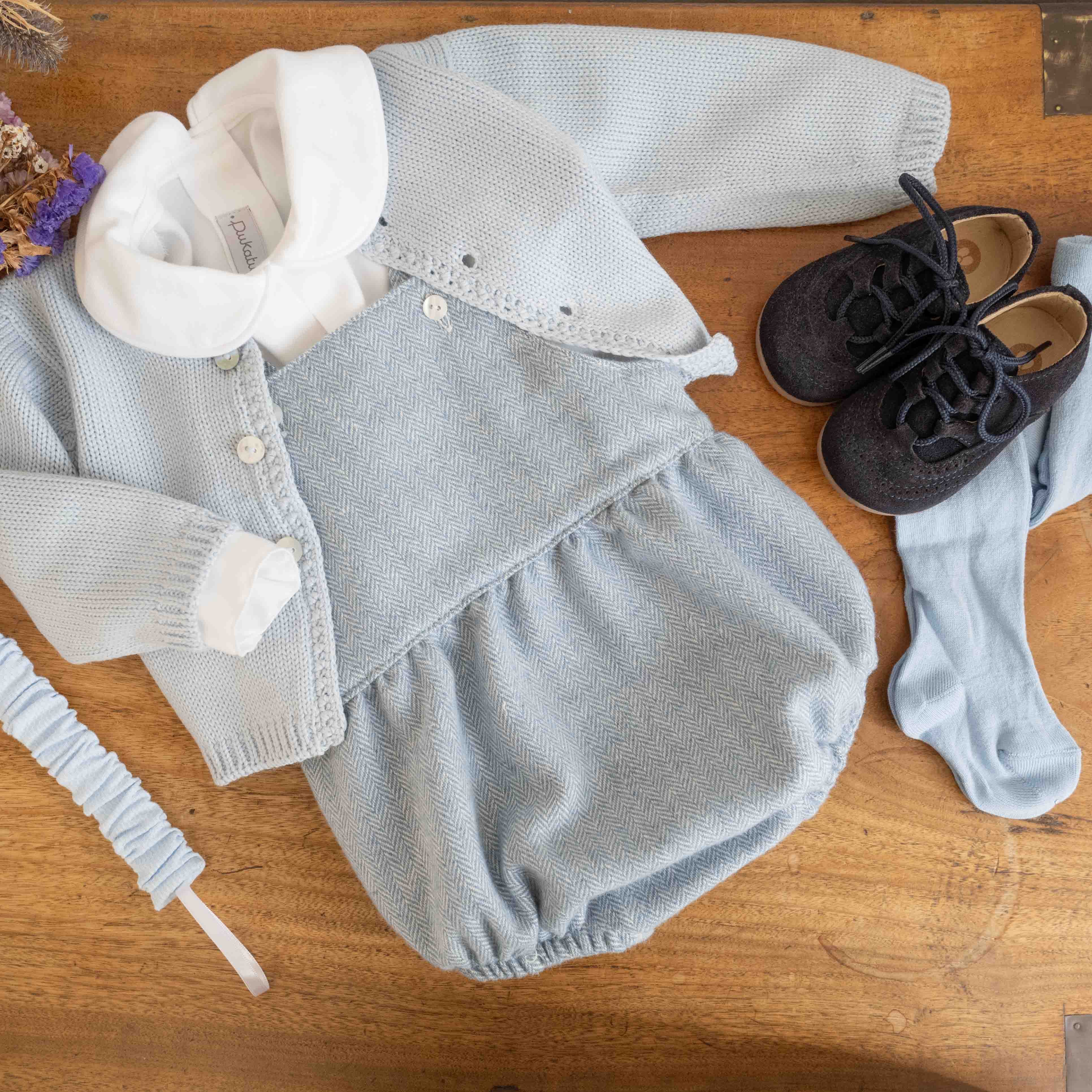 Bezaubernder Strampler aus blauem Fischgrätenstoff, komplett gefüttert für zusätzlichen Komfort. Ein zeitloses und elegantes Stück, perfekt für jeden Anlass. Mit Stolz in Portugal hergestellt.