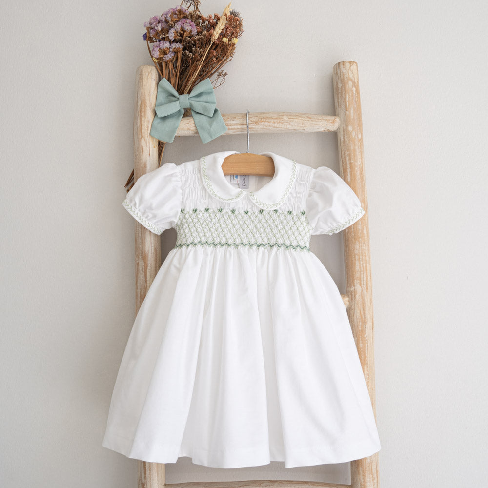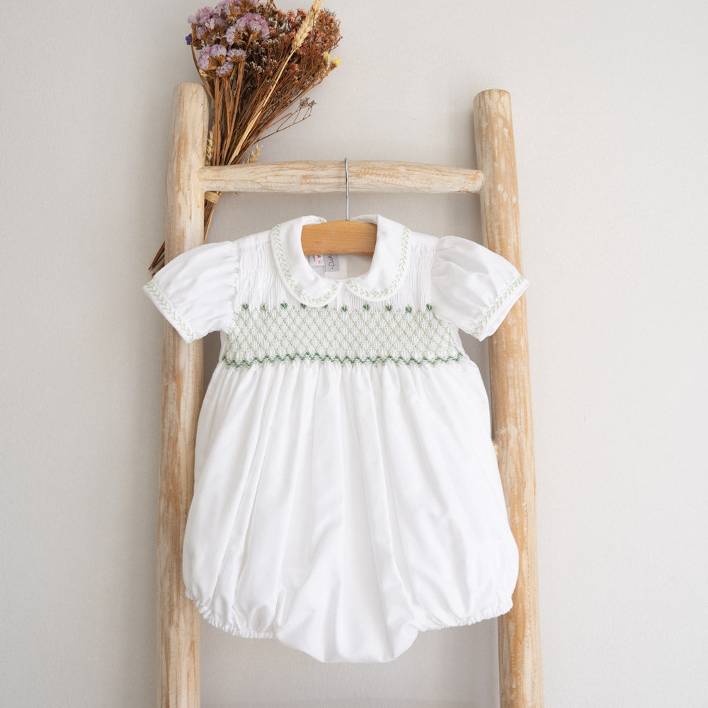 Dieser süße Strampler hat einen klassischen Peter-Pan-Kragen mit zarter Stickerei auf der Brust, dem Kragen und den Ärmelbündchen. Dieses Kleid ist für eine glatte Passform vollständig gefüttert und eignet sich perfekt für jeden besonderen Anlass. Es bietet einen zeitlosen Stil, mit dem Ihr Kleines auffällt. Es wurde in Portugal entworfen und hergestellt und vereint Schönheit, Qualität und Liebe zum Detail.