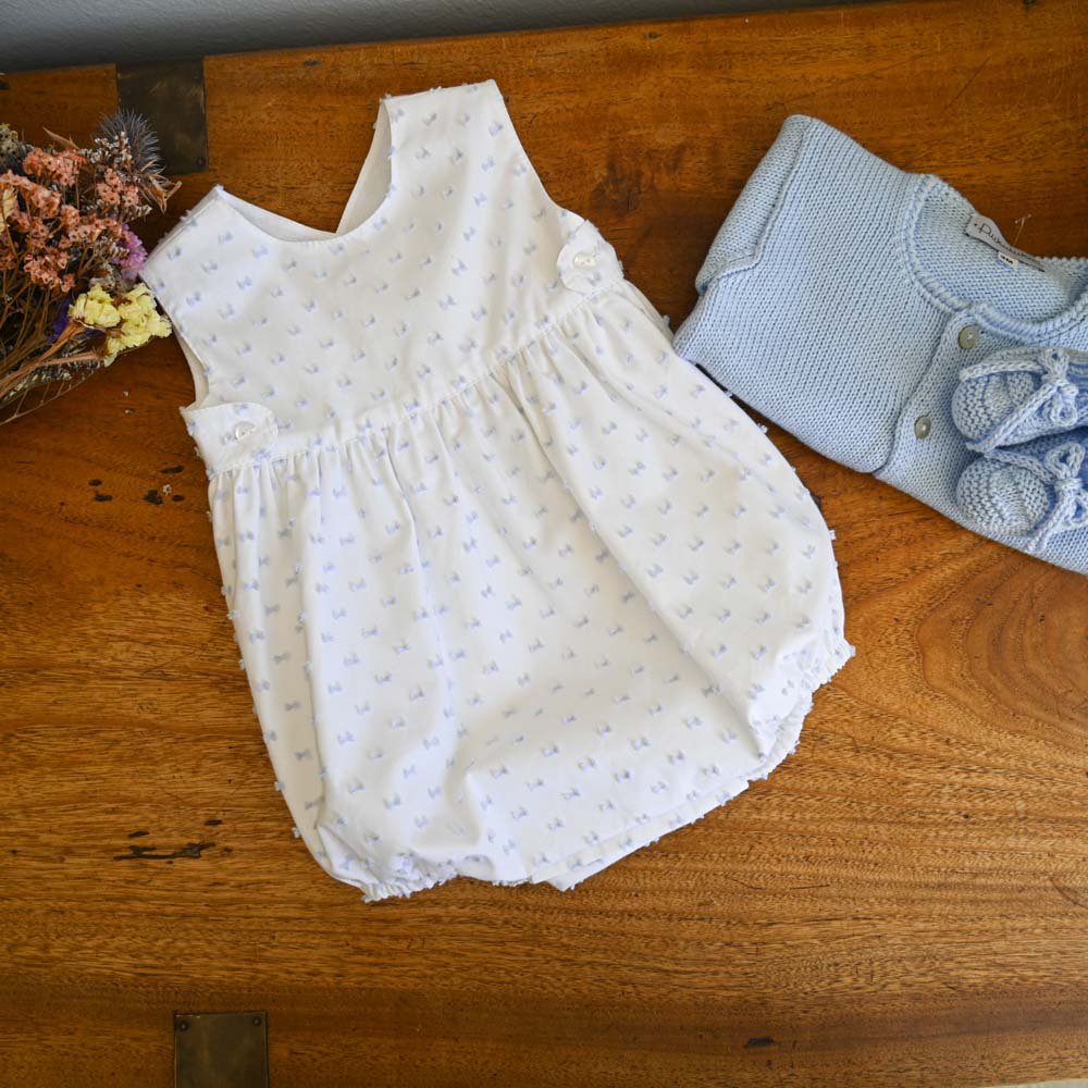 Delicate sleeveless romper in soft plumeti cotton, featuring a side-tie belt for an elegant touch. Fully lined and made from 100% cotton for ultimate comfort. Perfect for any occasion. Made in Portugal.