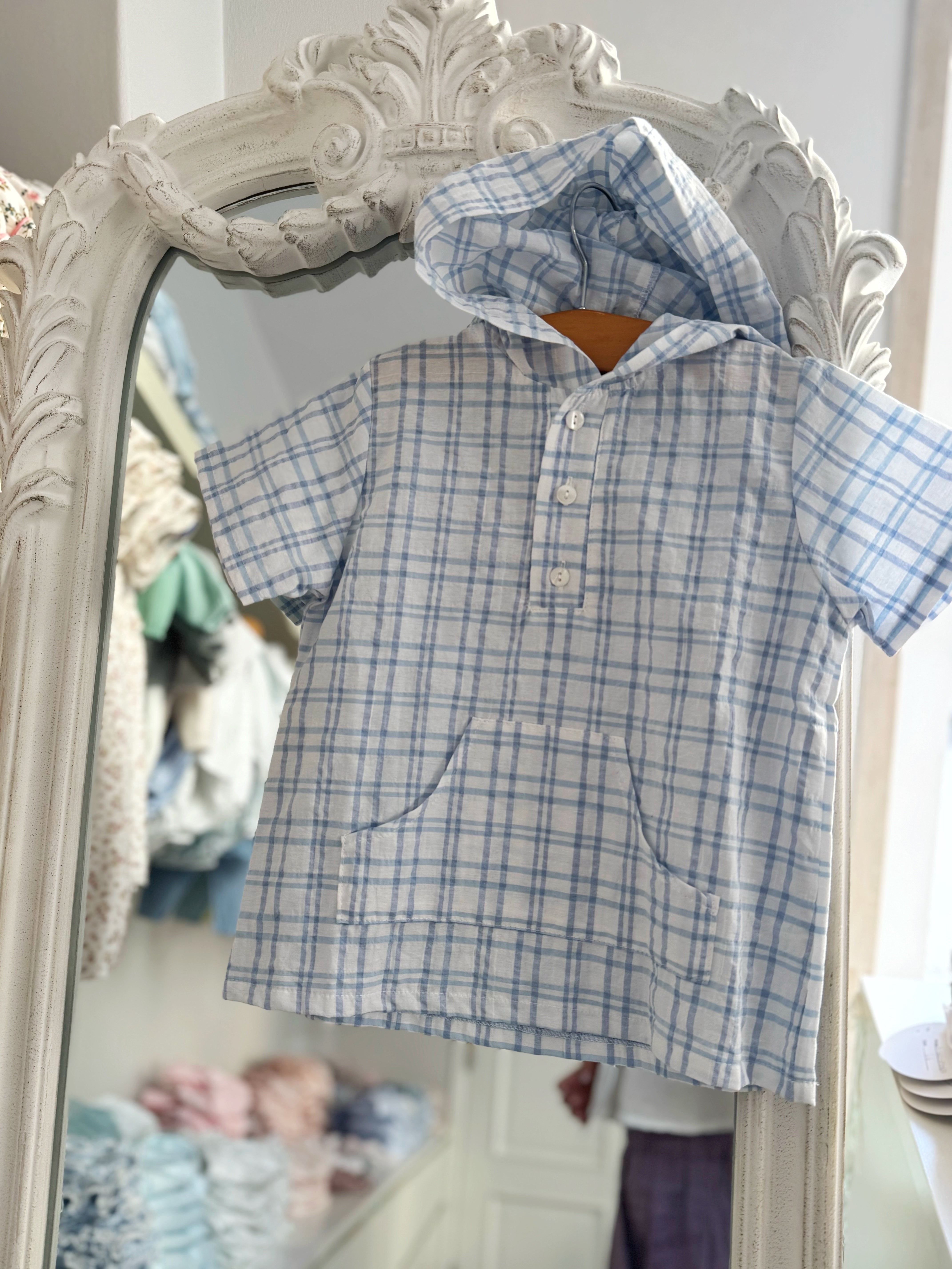 Boys Short-Sleeve Shirt with Hood in Light Blue Check Pattern