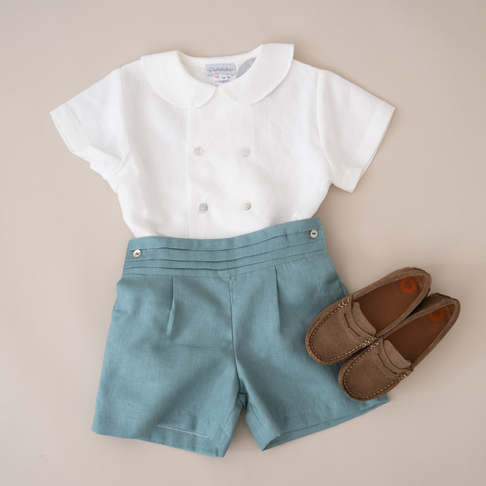Classic and elegant, these linen shorts are perfect for special occasions. Featuring a delicate waistband for a refined fit, they add a sophisticated touch to any little boy’s look. Made in Portugal.