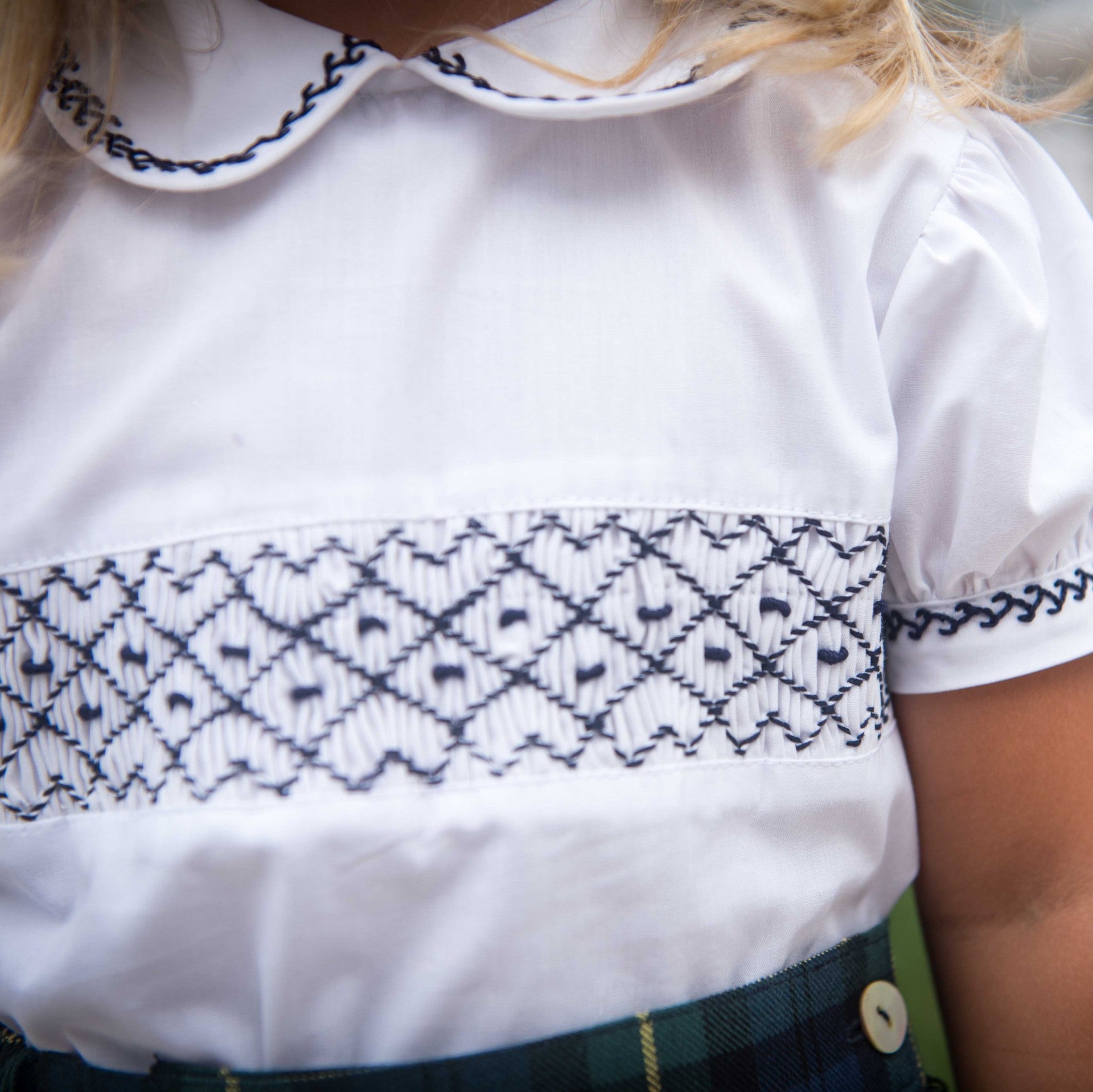 Kurzärmliges Baumwollhemd mit Peter-Pan-Kragen und Puffärmeln. Handbestickt auf Brust, Manschetten und Kragen. Hergestellt in Portugal