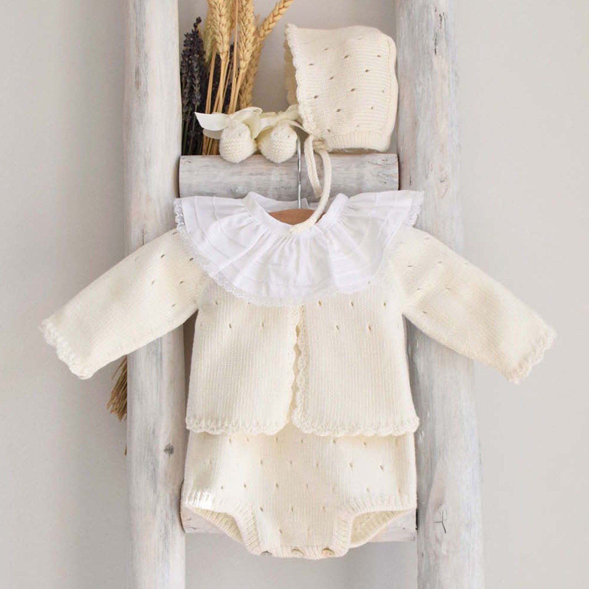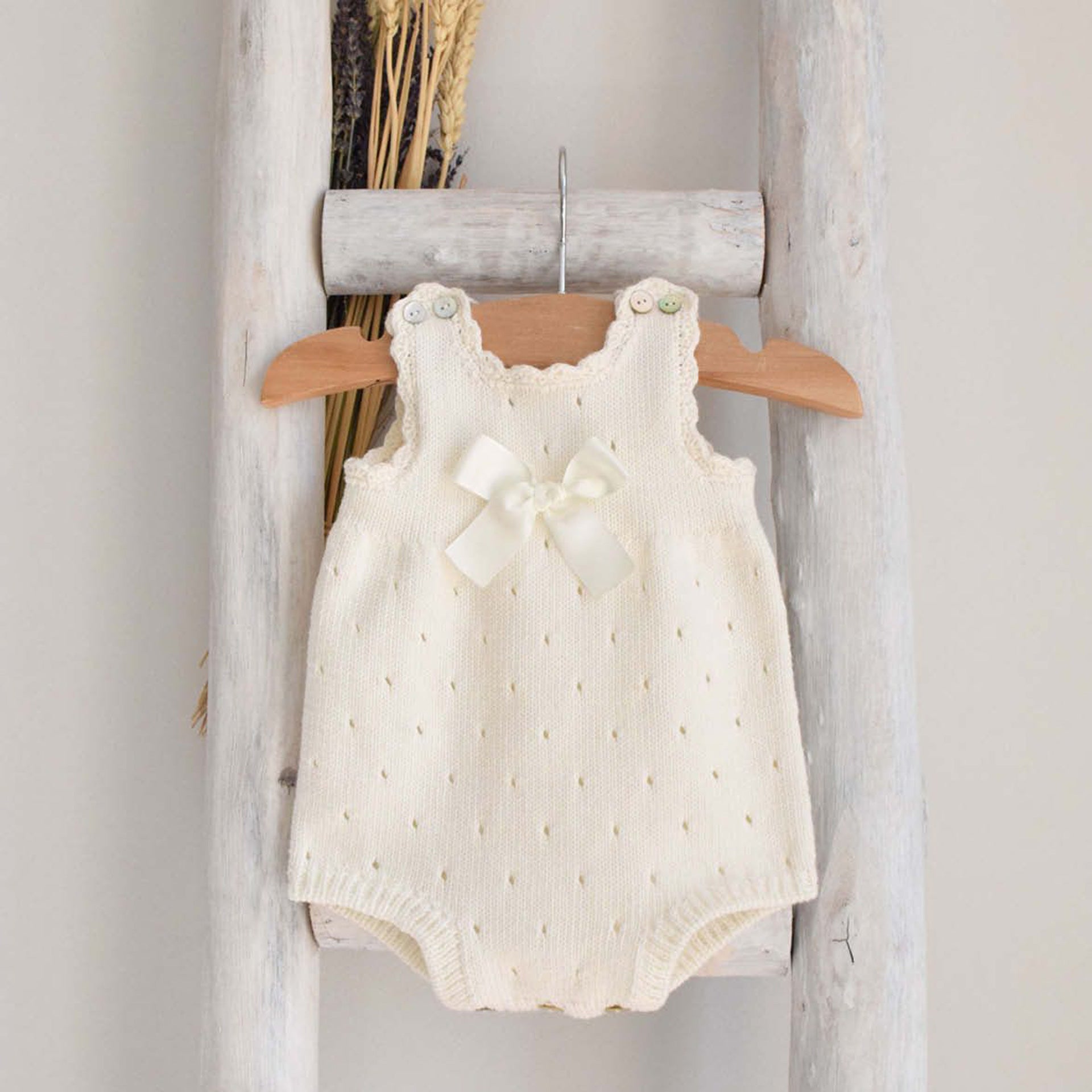 This beautifully knitted romper features delicate eyelet and a charming bow at the front, creating a sweet and adorable look. Pair it with the matching cardigan, hat, and booties from the same collection for a perfect coordinated outfit. Made from ultra-soft and comfortable cotton in Portugal.