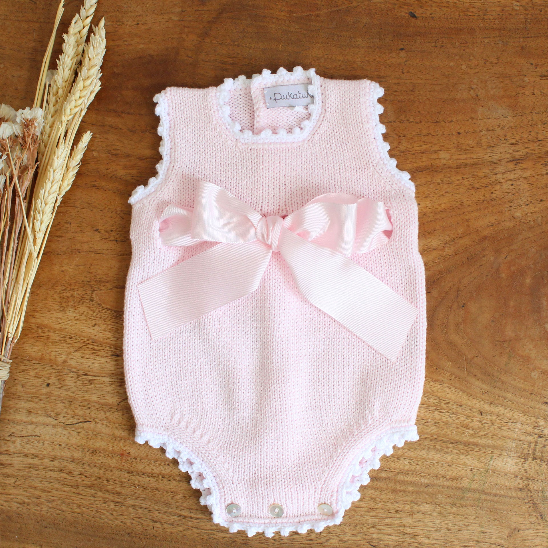 Gestrickter Baumwoll-Strampler mit großer Schleife vorne und handgefertigten kontrastierenden weißen Verzierungen. Hergestellt in Portugal
