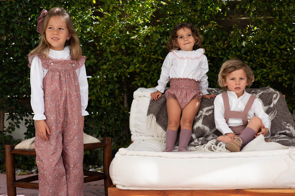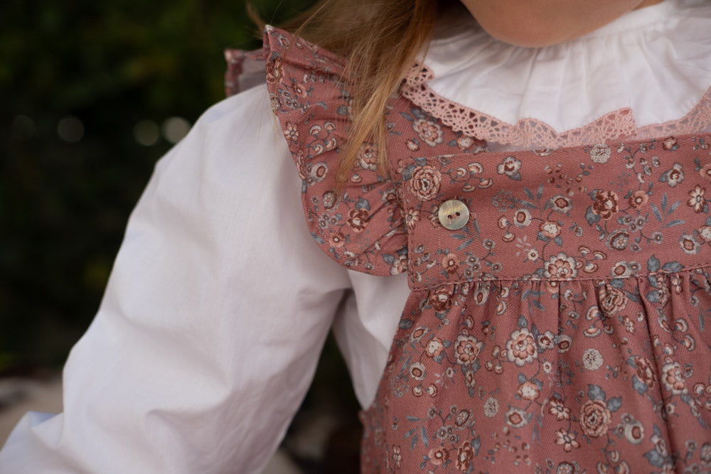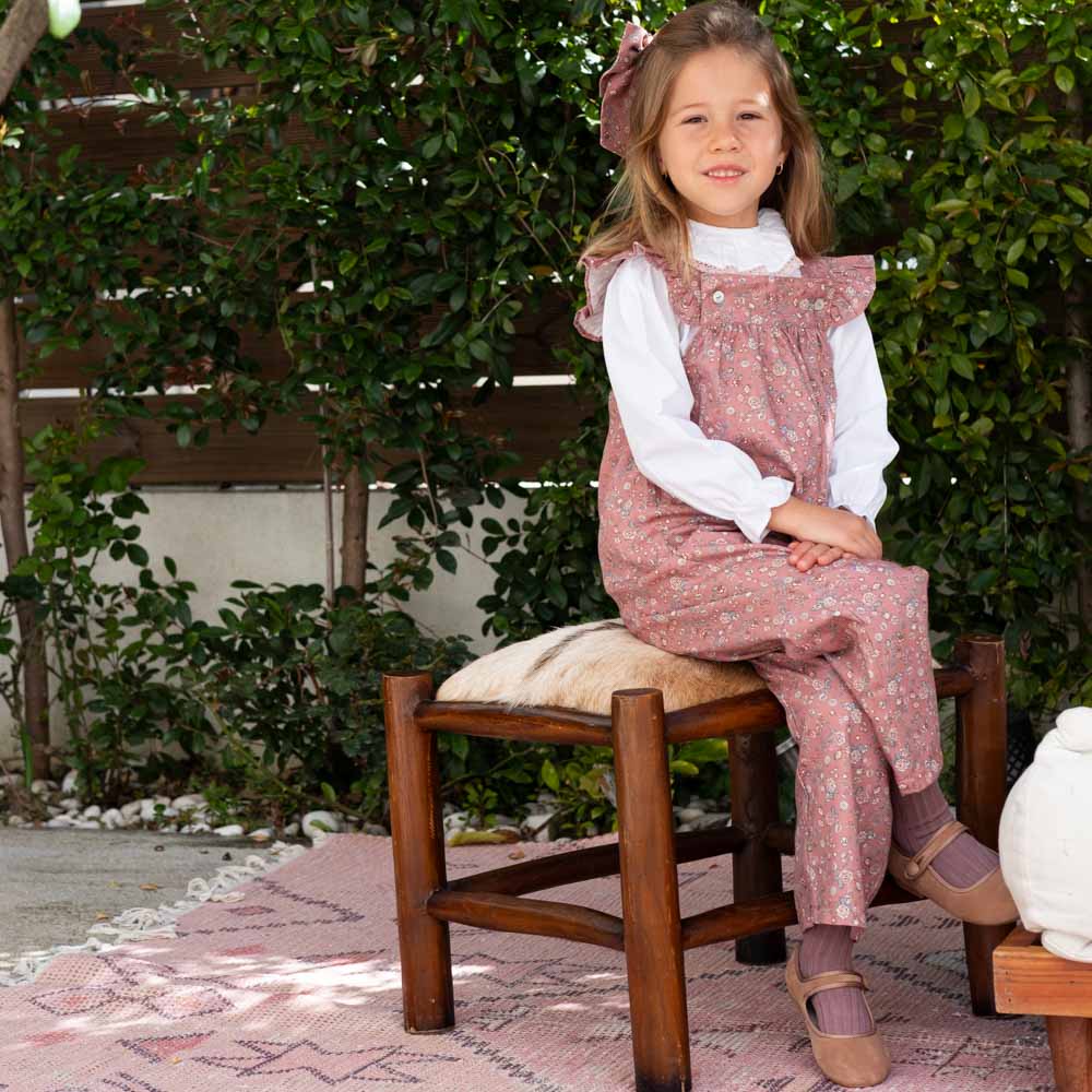 Girls Overalls with Paisley Pattern in Dusty Pink Tones and Ruffled Shoulder Detail. 100% cotton. Made in Portugal
