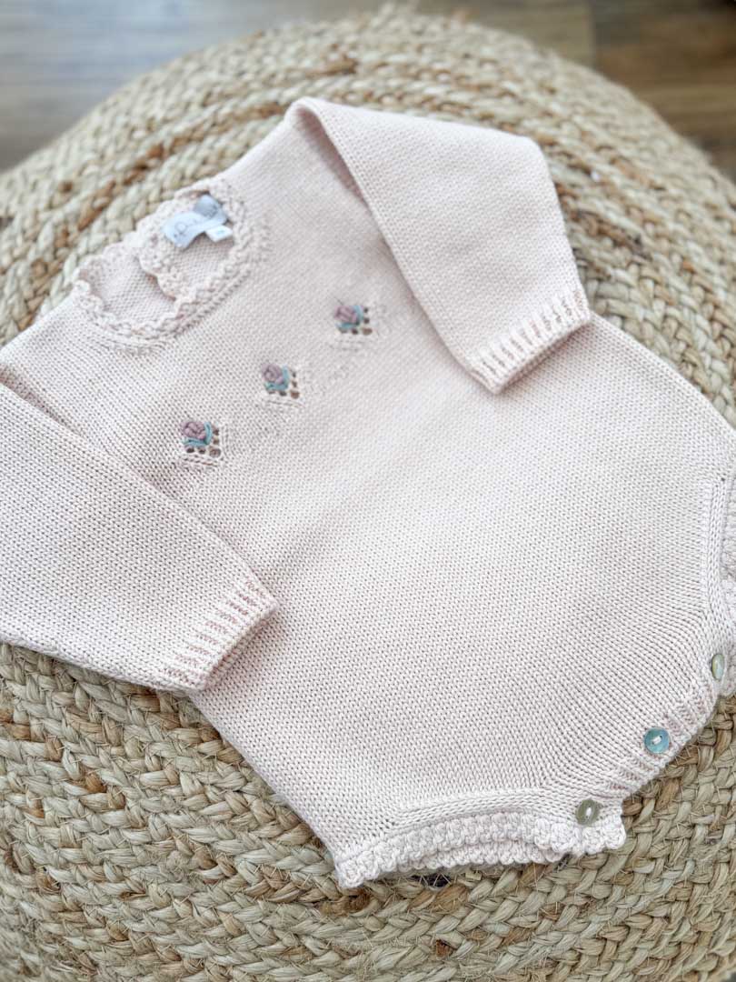 Knit romper with hand-embroidered flowers, made using high-quality, low-shedding wool yarn to minimize allergies. Soft, gentle to the touch, and comfortable — ideal for sensitive skin. Made in Portugal