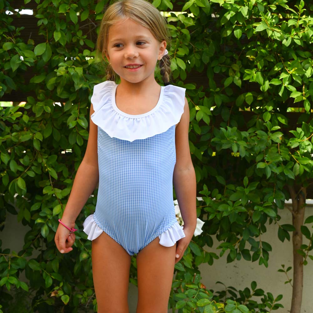 Klassisch und zeitlos, dieser Badeanzug hat ein bezauberndes blaues Gingham-Muster und eine knackige weiße Schleife auf der Rückseite. Die gekreuzten Träger verleihen einen zusätzlichen Hauch von Eleganz und sorgen für einen sicheren Sitz. Hergestellt in Portugal