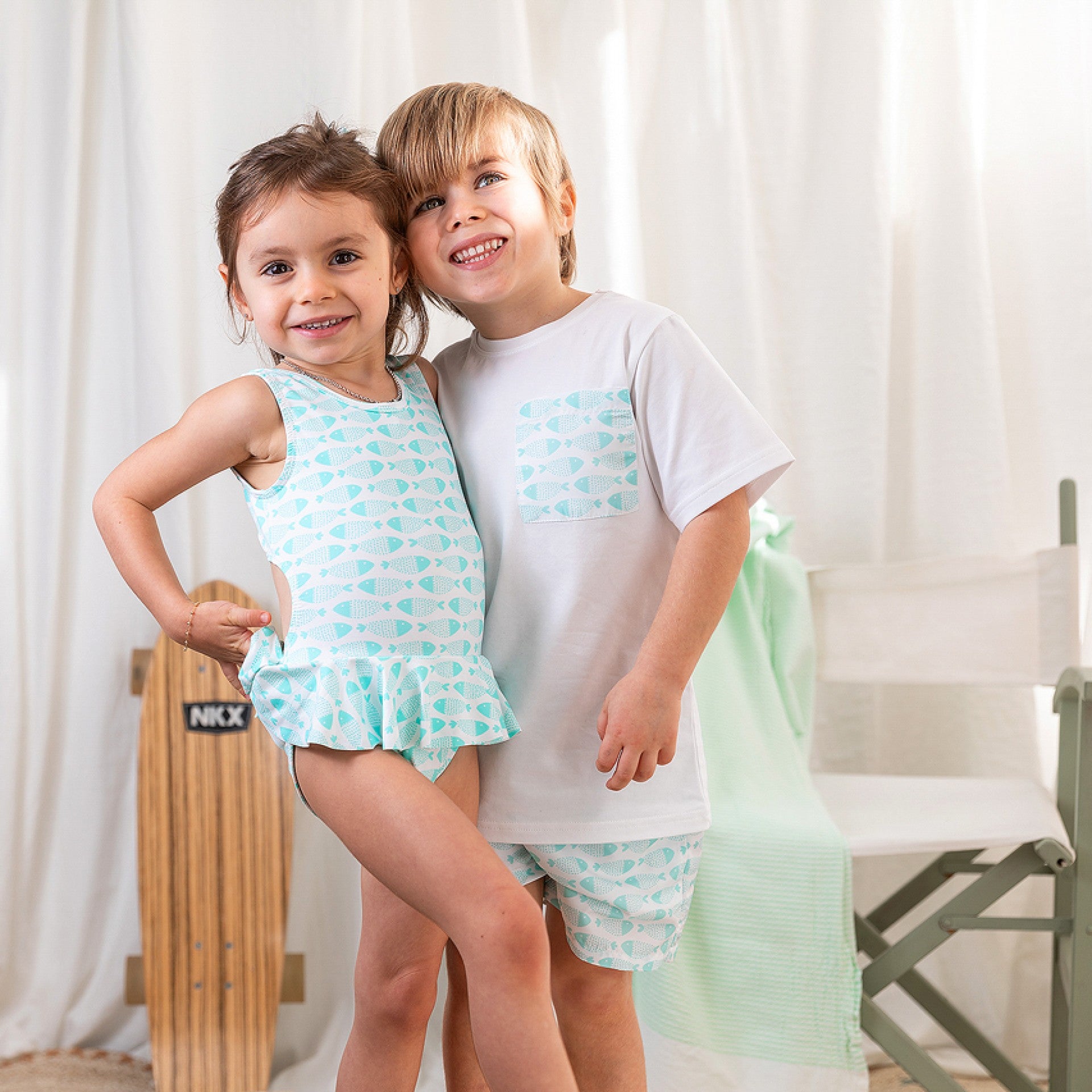 Badeanzug mit verspieltem Fischmuster und zarter Rüsche an der Taille. Perfekt für sonnige Tage und endlosen Spaß am Wasser!!