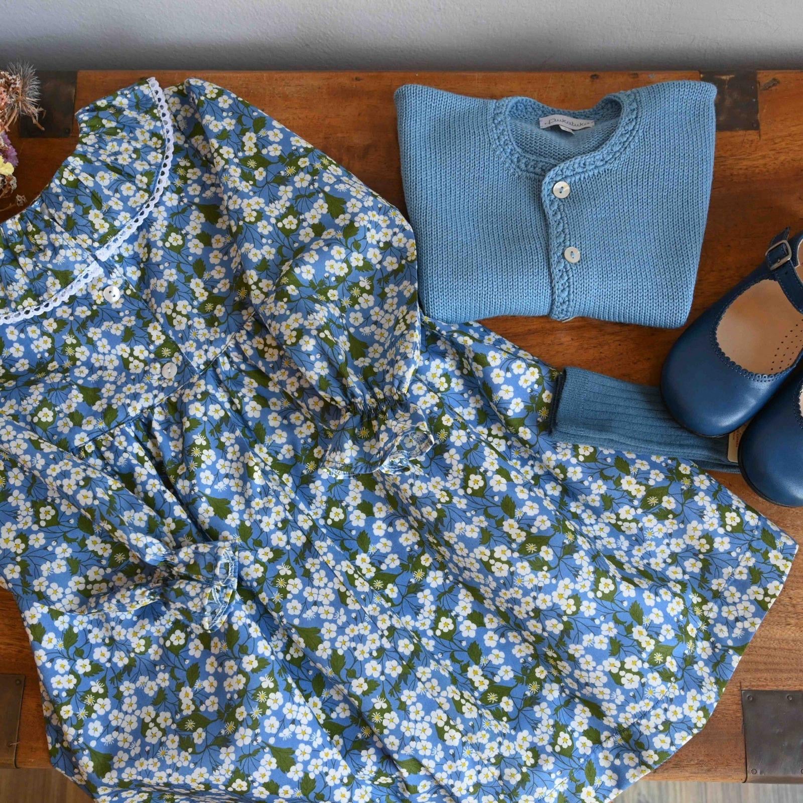 Elegant long-sleeve dress for girls in a delicate Liberty floral pattern. Features a frilled collar with lace detailing for a timeless touch. Fully lined for comfort and quality. Made in Portugal.