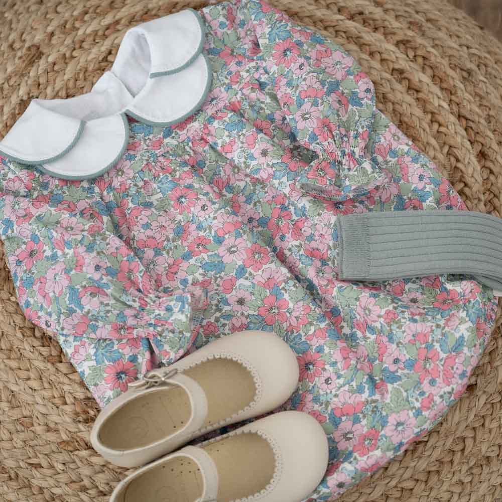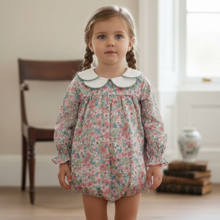 Girls' Liberty Print Romper featuring a Scalloped Collar with a green trim. Fully lined. 100% cotton (Liberty Fabric).