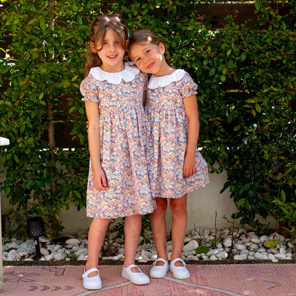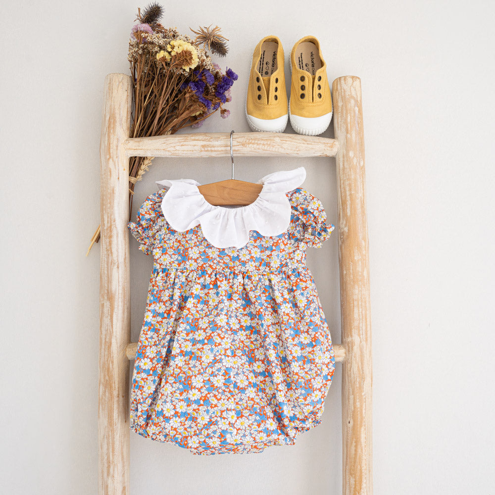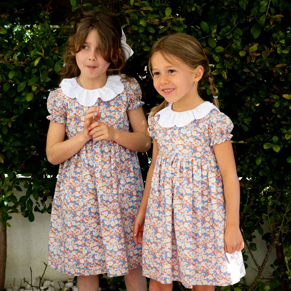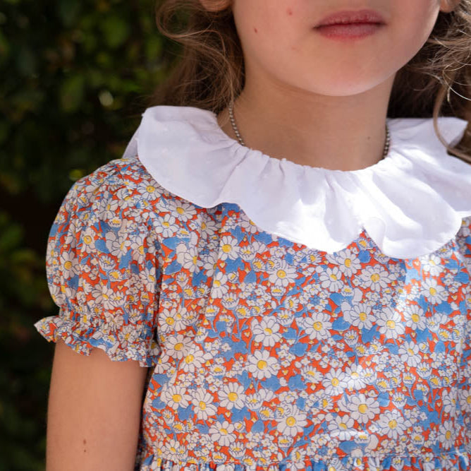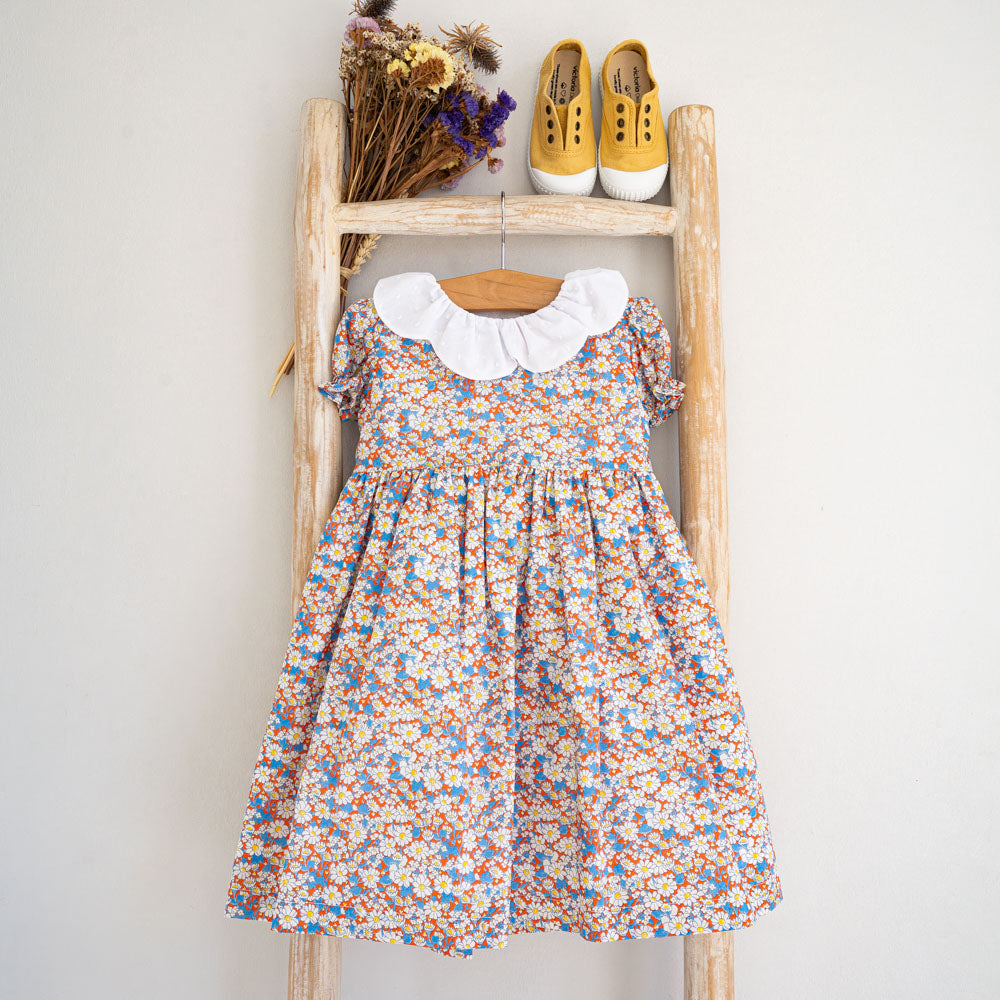 Dieses bezaubernde und elegante Kleid im Liberty-Print-Stil besticht durch ein wunderschönes Blumenmuster, das durch einen zarten, gewellten Rüschenkragen mit weißen Plumetti-Ausschnitten für einen zusätzlichen Hauch von Raffinesse aufgewertet wird. Es ist für mehr Komfort vollständig gefüttert und eignet sich perfekt sowohl für legere Ausflüge als auch für besondere Anlässe.
