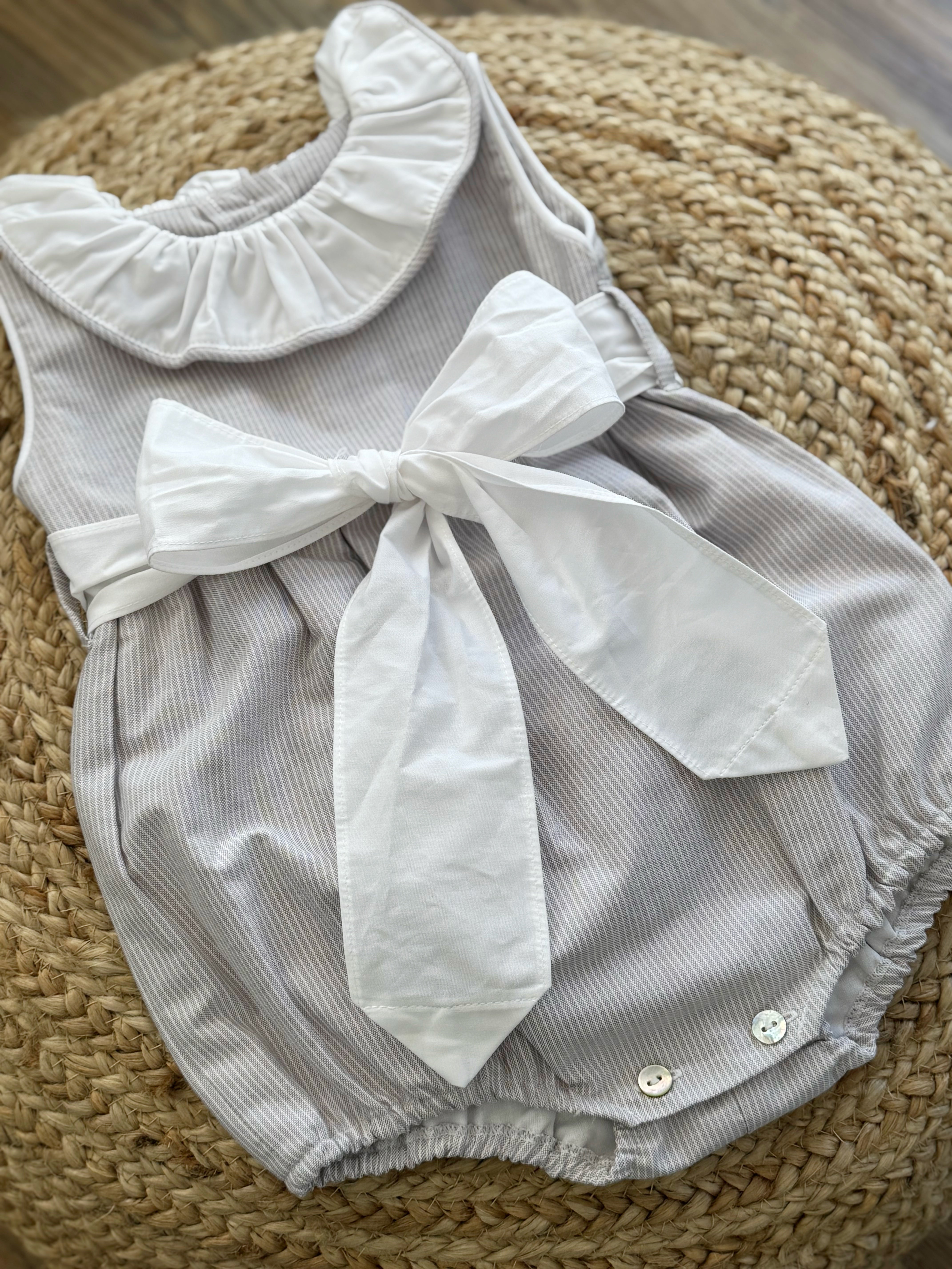 Striped Romper with Ruffled Collar and Front Bow. 100% cotton