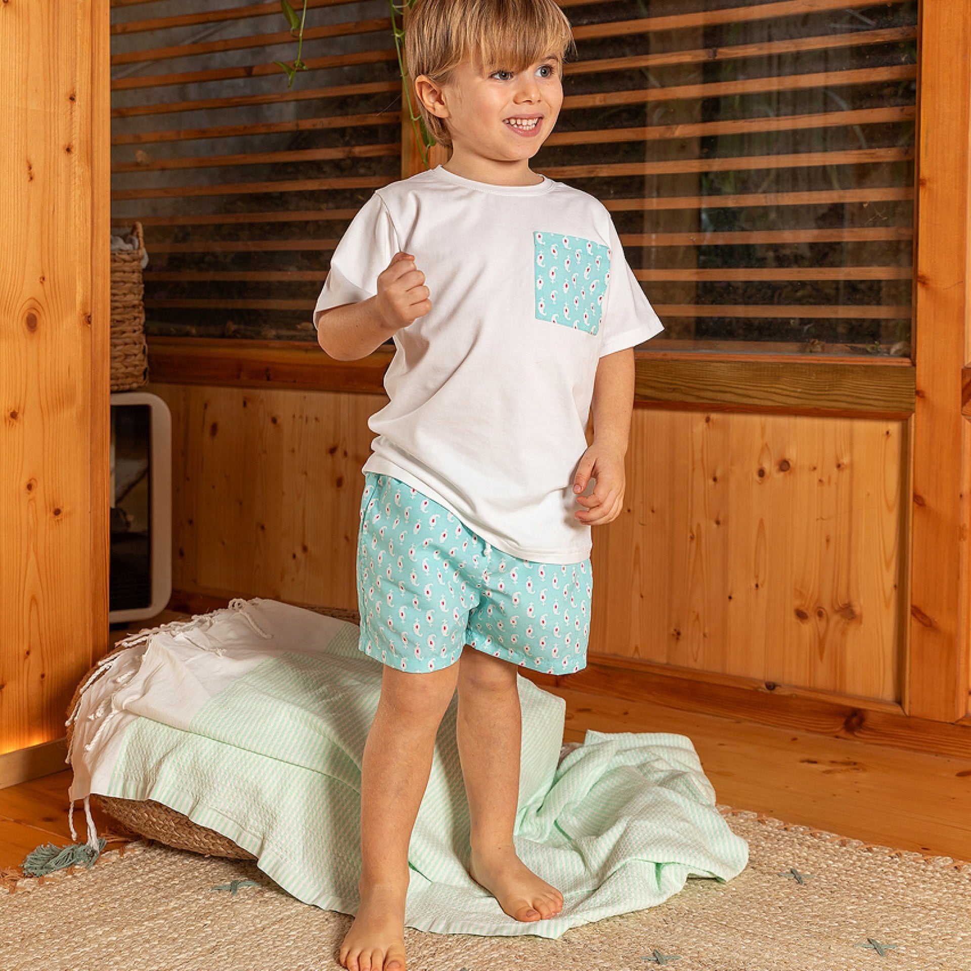 Weiches und bequemes T-Shirt mit Tasche und passendem Muster zu unseren Badeshorts. Das perfekte Sommer-Essential für einen abgestimmten und stylischen Look. Hergestellt in Portugal.