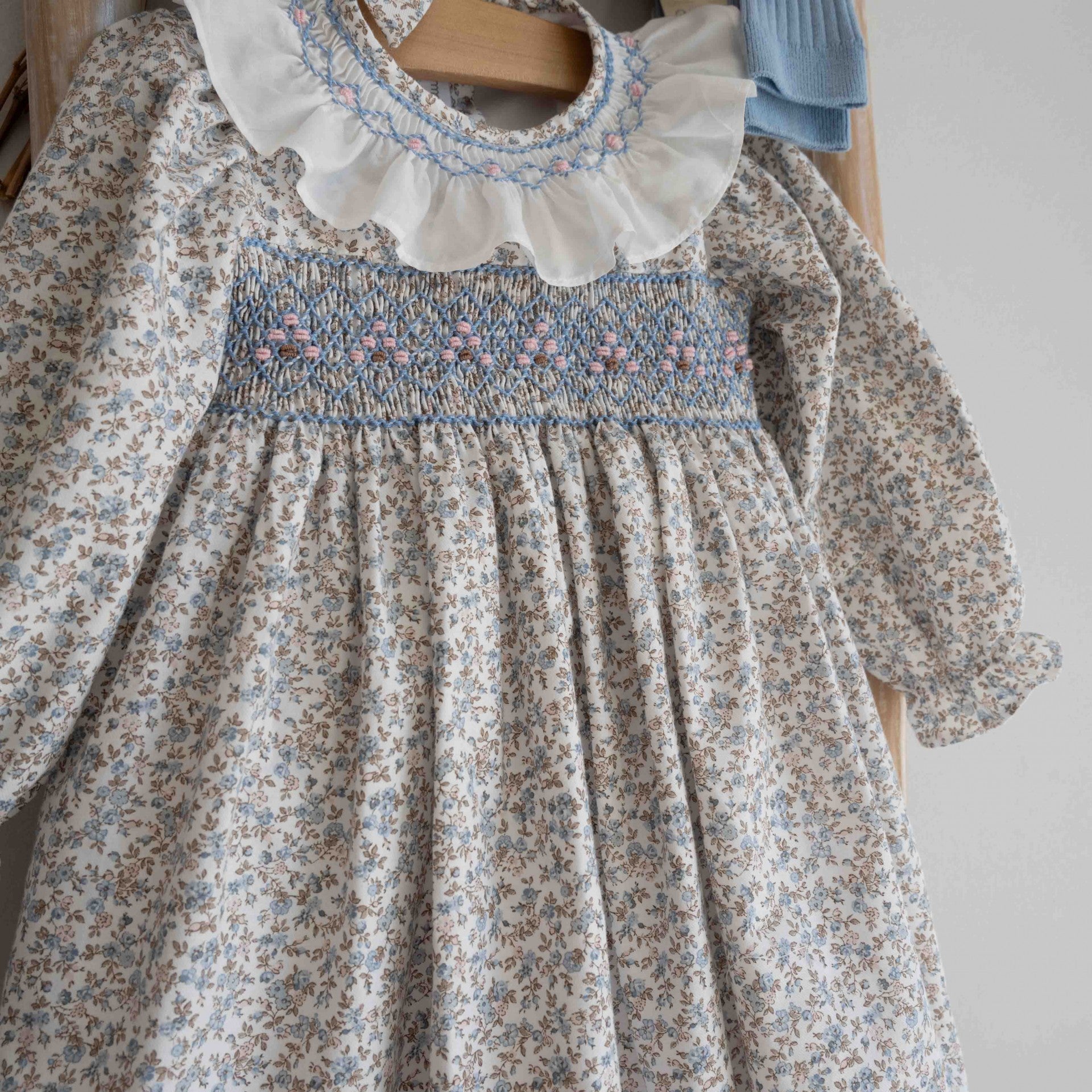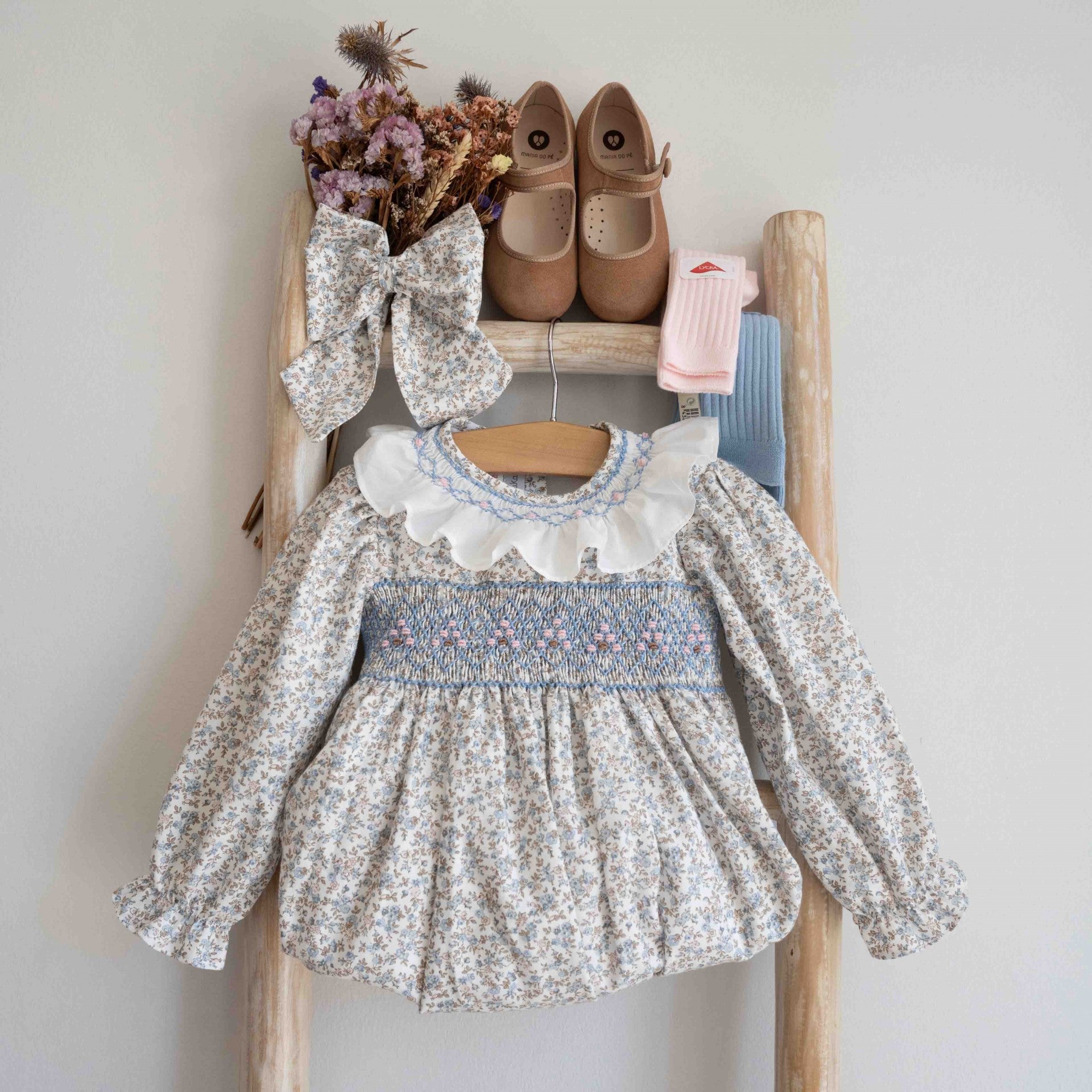 Dieser zarte Strampler hat einen wunderschönen Blumendruck, ergänzt durch handgestickte Details auf der Brust und dem Rüschenkragen, die ihm eine elegante und raffinierte Note verleihen. Die langen Ärmel und die Schleife auf der Rückseite vervollständigen das Design und verleihen dem Stück ein einzigartiges und charmantes Finish.
